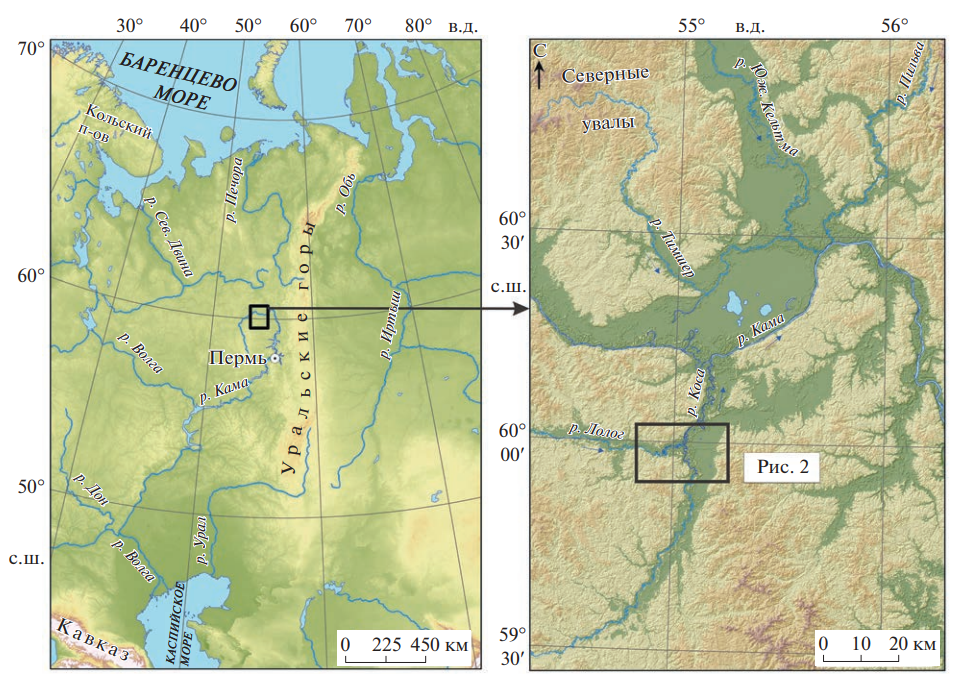 В качестве такого района может рассматриваться место слияния рек Лолог и Коса в северном Прикамье ( рис. 1 ), где первые люди появляются в раннем голоцене. Предыдущие исследования показали достаточно тесную связь между локальными природными обстановками и выбором стратегий расселения человеческих обществ в долине Верхней Камы в голоцене (Зарецкая и др., 2020; Лычагина и др., 2021).