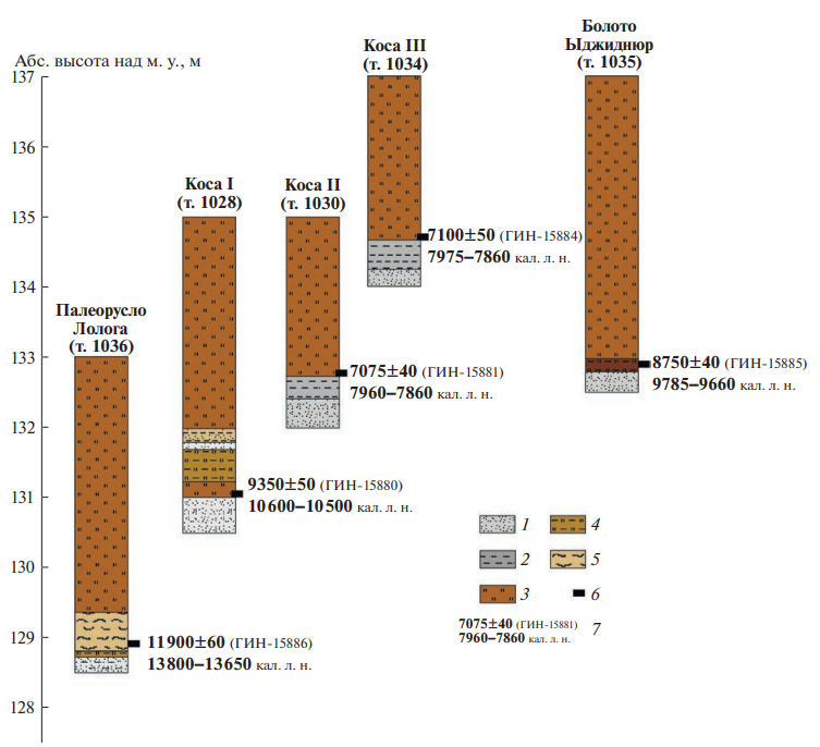 1036(палеорусло Лолога) | 0—3.7 м — торф коричневый 3.7—4.2 м — сапропель бежевый зернистый, очень плотный, сухой (14С: 4.05—4.15 м) 4.2—4.34 м — торф суглинистый 4.34—4.4 м — песок серый оглиненный | ГИН-15886 | 11900 ± 60 | 13650-13800 | 59.968608° 55.017849° | 133 |