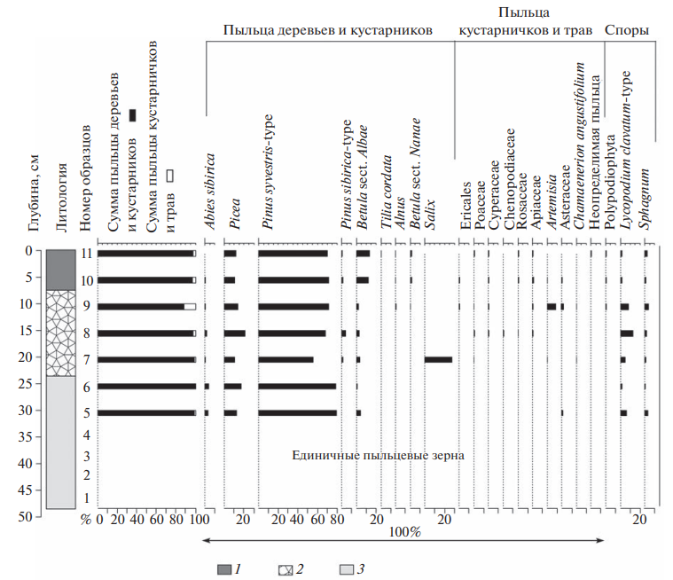 Рис. 4. Спорово-пыльцевая диаграмма культуросодержащих и подстилающих отложений стоянки Коса II. 1 – песок “подзол”; 2 – супесь “культурный слой”; 3 – песок “материк”. Fig. 4 . Pollen diagram of the culture-bearing and underlying sediments of the Kosa II site. 1 – sand “podzol”; 2 – sandy loam “cultural layer”; 3 – sand “sterile layer”.