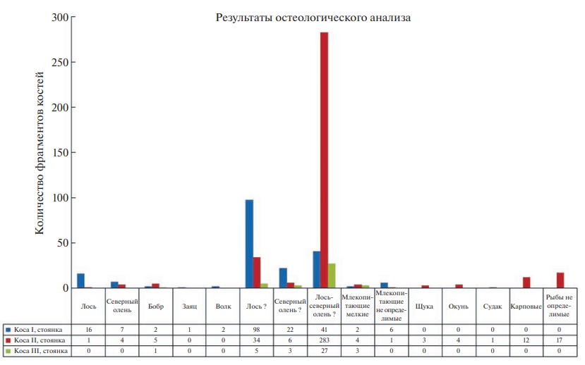 Рис. 5. Результаты остеологического анализа. Знак вопроса означает, что кости принадлежат животному, сравнимому по размерам с указанным. Fig. 5 . The results of osteological analysis. The question mark means that the bones belong to an animal comparable in size to the one indicated.