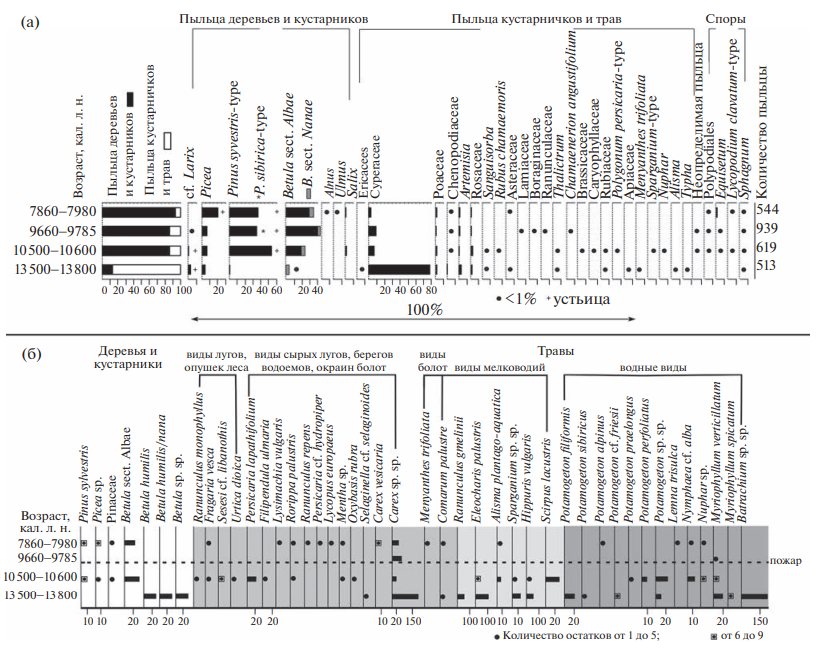 Данные по макроостаткам растений показали, что в ландшафте преобладали кустарниковые березы Betula humilis . Встречались относительно холодолюбивые виды: плаунок Selaginella selaginoides и эндемичный для Урала Potamogeton sibiricus (Флора Сибири, 1988; Поспелова, Поспелов, 2007). Была развита растительность мелководной зоны из Hippuris vulgaris и Sparganium . Среди околоводных видов доминируют осоки Carex , а также Eleocharis palustris и Ranunculus gmelinii , что указывает на существование отмелей. В условиях холодного климата позднеледниковья здесь находился водоем с низкорослой околоводной растительностью и зарослями из кустарниковых берез по берегам ( рис. 6, (б)).