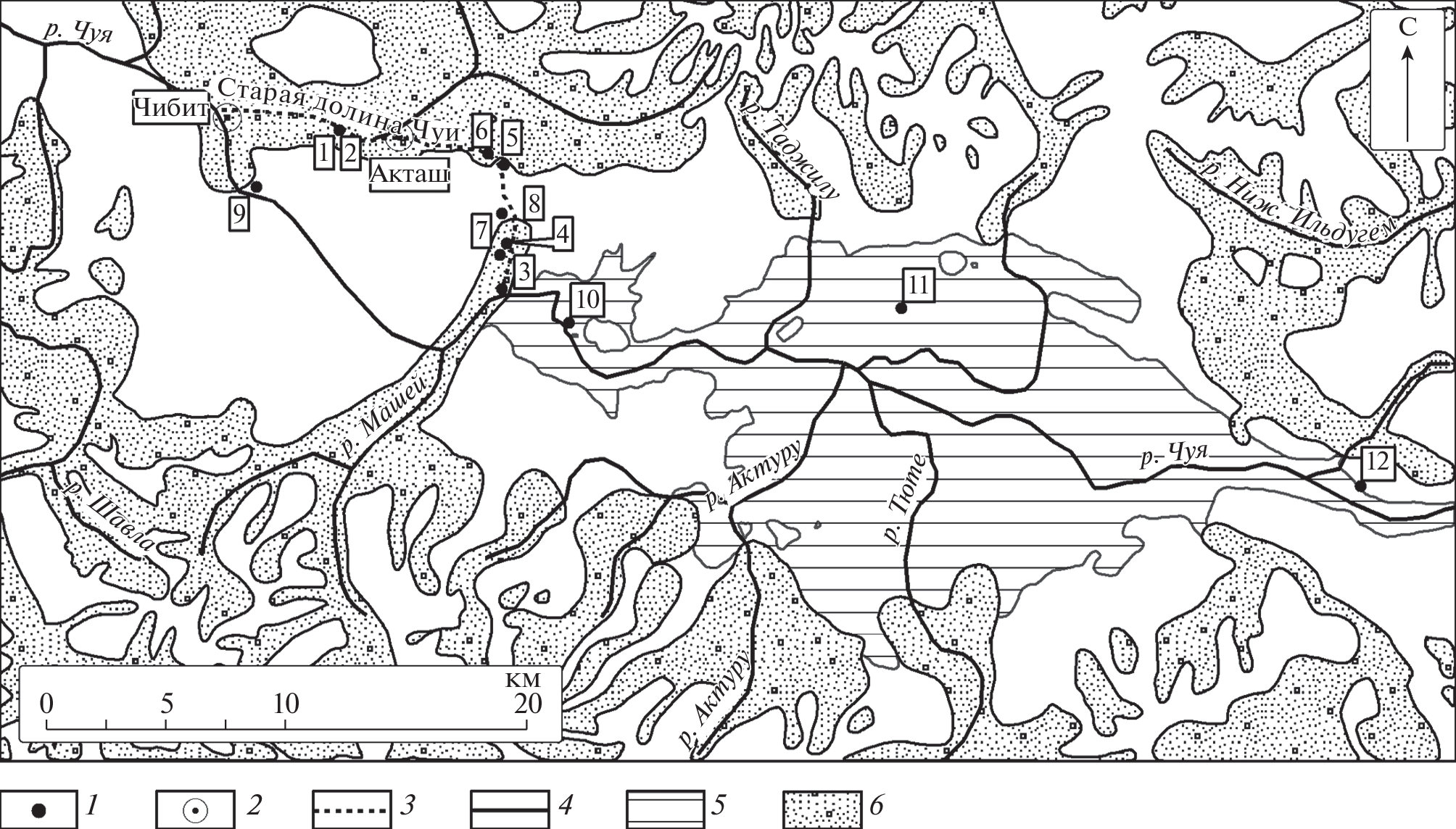 Рис. 1. Палеогеографическая схема района средней Чуи на максимум Чибитского оледенения. 1 – точки наблюдения (цифры в прямоугольниках – номера точек); 2 – населенные пункты; 3 – канал прорыва баратальского озера в старой долине Чуи; 4 – основные реки; 5 – Баратальское ледниково-подпрудное озеро; 6 – области распространения ледников времени LGM по ДЗ и полевым наблюдениям. Fig. 1 . A Paleogegeographic map of the basin of the middle Chuya and the proposed scheme for the distribution of the Chibit glaciation. 1 – observation points (numbers in rectangles – numbers of points); 2 – settlements; 3 – channel of the outburst of the Baratal lake in the old Chuya valley; 4 – main rivers; 5 – Baratal ice-dammed lake; 6 – areas of distribution of glaciers of the LGM time according to remote sensing and field observations.