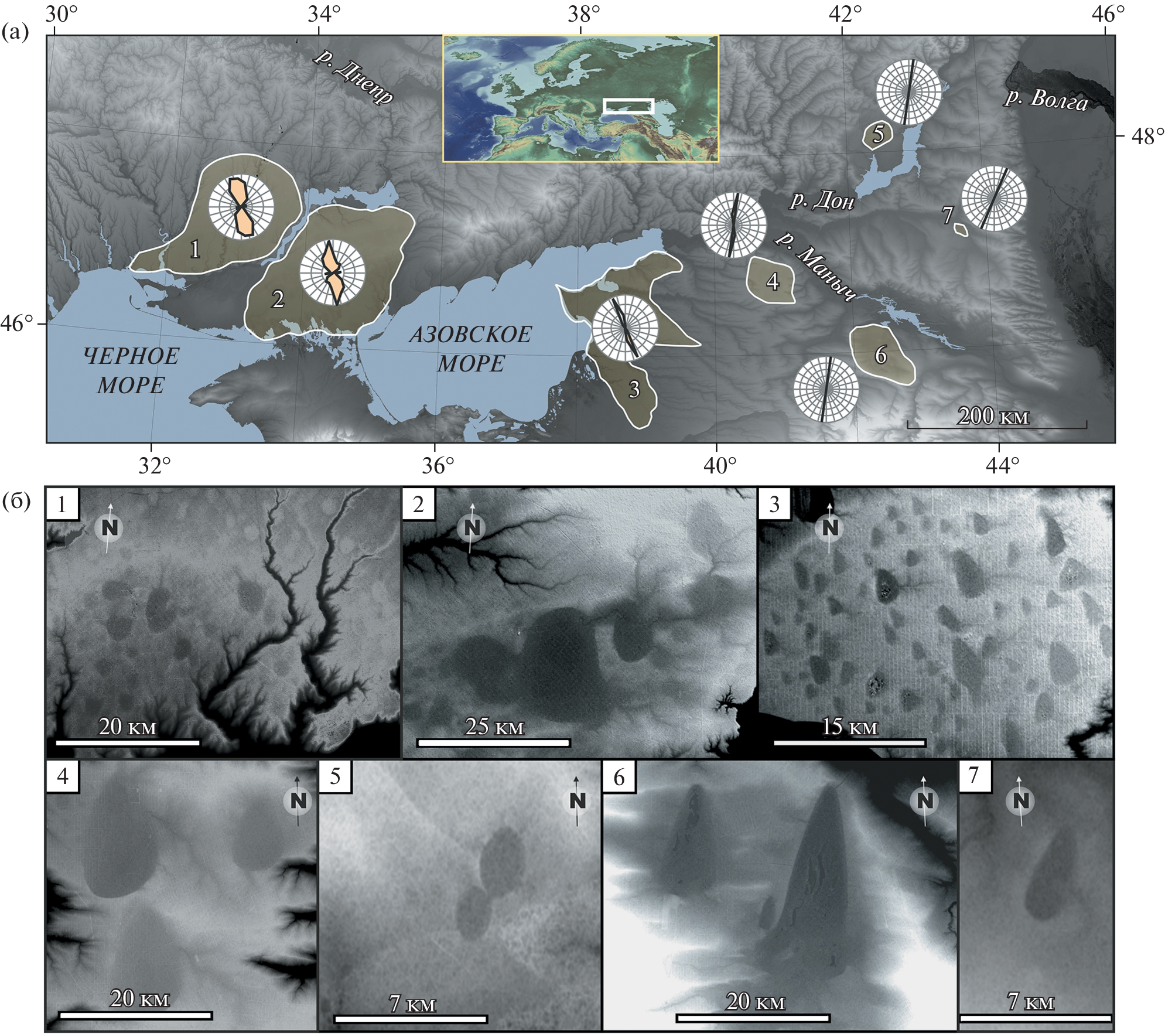 Рис. 1. Распространение крупных западин на юге Восточно-Европейской равнины. (а) – положение ареалов распространения крупных западин; (б) – структура западинного рельефа в выделенных ареалах. Роза-диаграммы на карте (а) показывают направления длинных осей западин. Топографическая основа – модель SRTM. Fig. 1 . Distribution of large oriented depressions in the south of the East European Plain. (a) – position of large oriented depressions sites; (б) – structure of relief in selected sites. The rose diagrams on the map (a) show the directions of the long axes of large oriented depressions. The topographic base is the SRTM model.