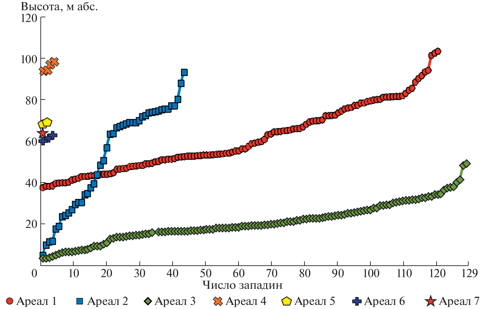 Пояс крупнозападинного рельефа протягивается в субширотном направлении от Березанского лимана на западе до долины р. Маныч на востоке и Цимлянского водохранилища на северо-востоке. Депрессии распространены среди лёссовых низменностей степной зоны, их распространение не зависит от тектонического и дочетвертичного геологического строения. Абсолютные высоты в пределах изучаемой территории изменяются от 0 до 105 м, а большая часть западин лежит ниже 70 м ( рис. 2 ). Междуречья и речные террасы покрыты лёссовым чехлом (Velichko, 1990; Haase et al., 2007), мощность которого варьирует от нескольких метров до 40–50 м (Балаев, Царев, 1964; Молодых, 1982; Tesakov et al., 2007; Velichko et al., 2012; Konstantinov et al., 2018). Западины распределены не равномерно по рассматриваемой территории, а сгруппированы в обособленные ареалы ( рис. 1 , (а)), внутри которых наблюдается специфика размеров и форм этих образований. Количество западин сильно варьирует между ареалами – от нескольких западин до более чем сотни объектов. Всего можно выделить семь ареалов ( рис. 1 , (б)) распространения крупных западин, в которых нами было зафиксировано 312 таких форм. Повышенные мощности лёссов тяготеют к востоку изучаемой территории – Западному Предкавказью и бортам долины р. Маныч. Максимальных значений (40–50 м) мощность лёссового чехла достигает у подножья северного склона Ставропольской возвышенности в районе ареала 6 (Балаев, Царев, 1964).