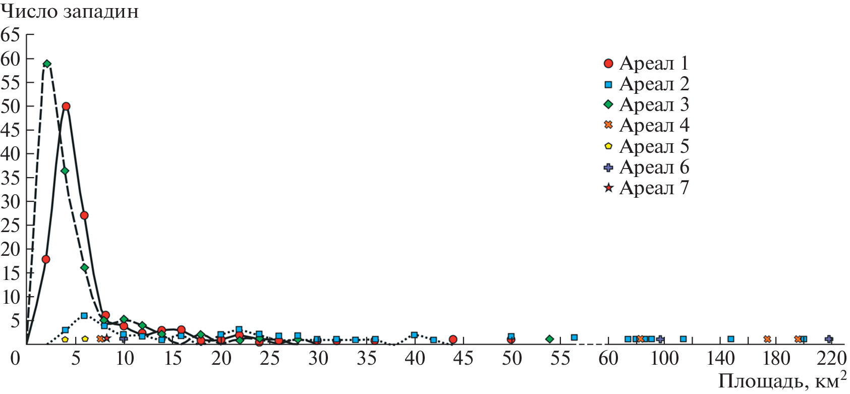 Ареал 1. В пределах ареала зафиксированы 124 крупные западины. Они распространены на междуречных пространствах от Березанского лимана на юго-западе до Каховского водохранилища на северо-востоке ( рис. 1, (б)–1). Территория расчленена долинами рек Южный Буг, Ингул, Ингулец, Днепр и их притоками. Поверхность имеет пологий наклон в направлении с севера на юг. Средний уклон равен 0.0007, падение составляет 0.7 м на 1 км. Абсолютные высоты изменяются от 30 до 90 м. Западины равномерно распределены по территории, 86% их них не имеют выраженных балок-притоков. Редко встречаются формы с одним-двумя притоками, в единичном случае их количество достигает четырех. Часть форм имеет связь с соседними западинами через небольшие долины. Днища депрессий ровные, субгоризонтальные, что не согласуется с общим уклоном фоновой поверхности. Северные склоны КЗ, как правило, немного выше южных. Элементы морфологии западин (бровки и тыловые швы) очень плавные, без резких границ. Плановая форма большинства КЗ близка к овальной, реже встречаются западины яйцевидной формы. 82% депрессий имеет не изометричную форму, т.е. они вытянуты. Коэффициент вытянутости в среднем 1.5. Из числа вытянутых депрессий 59% КЗ направлена по азимуту 330–360°. Площадь объектов меняется от 0.9 до 49.1 км 2 ( рис. 4 ). В среднем она составляет 6.5 км 2 , а модальный интервал составляет 2–4 км 2 . Глубина достигает 6 м, но модальное значение не превышает 2–3 м. Коэффициент корреляции между площадью и глубиной составляет 0.53.