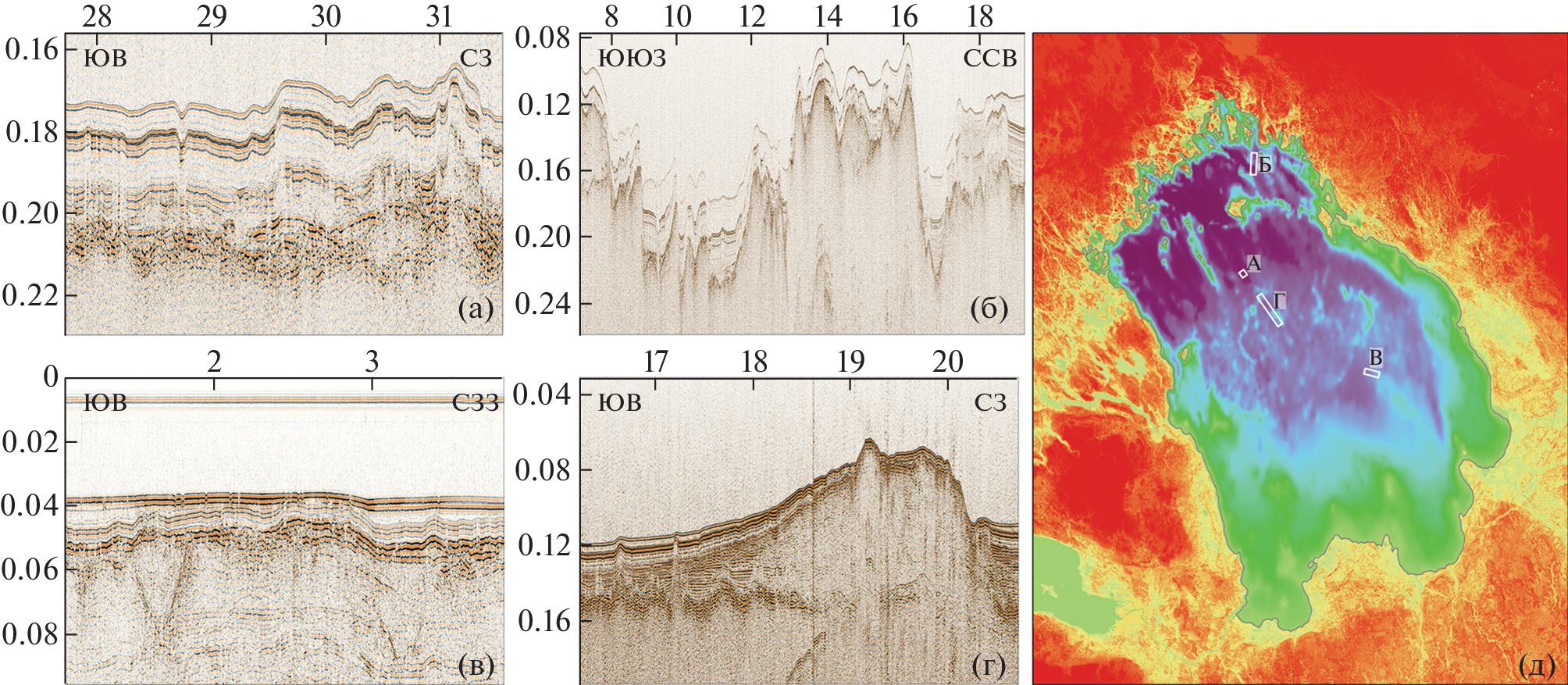 - Rybalko A.E., Subetto D.A., Tokarev M.Yu. (2015). Marine and lacustrine development stages of the Great European Lakes (obtained with seismoacoustic surveys). Geologiya morei i okeanov: Materialy XXI Mezhdunarodnoi nauchnoi konferentsii (Shkoly) po morskoi geologii. Iss. IV. Мoscow: GEOS (Publ.). P. 310–313. (in Russ.).