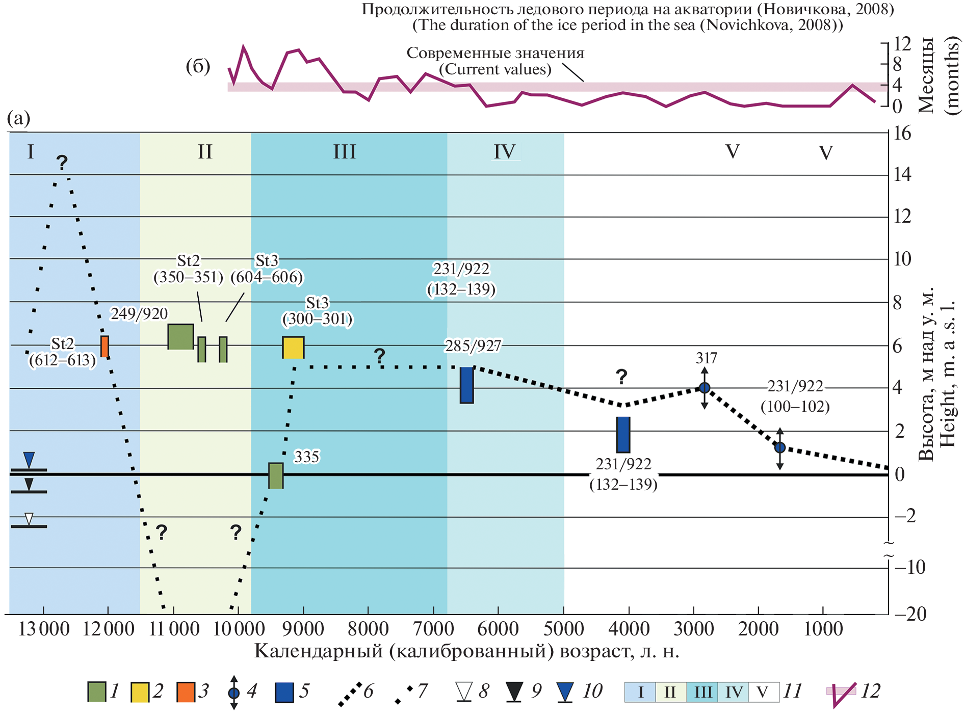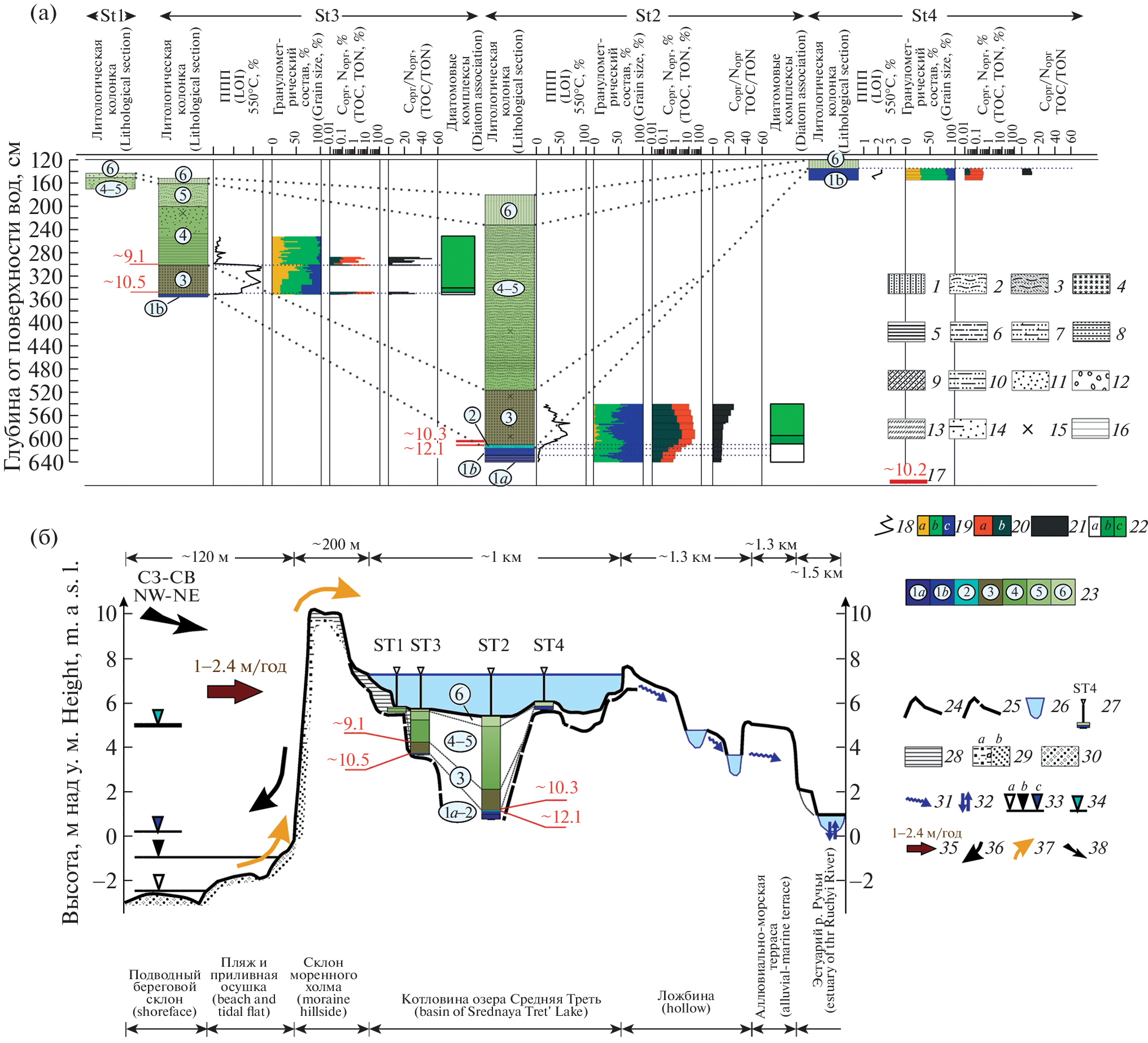 На восточном побережье пролива Горло впервые реконструированы основные черты изменения относительного уровня моря для интервала времени ∼12.1–9.1 тыс. кал. л. н. Для этого в котловине озера Средняя Треть (66.014009° с.ш., 41.086294° в.д.; урез – 7.3 м над у. м., порог стока 6.2 м над у. м.) проведены палеолимнологические, георадиолокационные и геоморфологические исследования, а также съемка окрестностей озера беспилотным летательным аппаратом. Донные отложения озера изучены в четырех скважинах, скоррелированных между собой по результатам интерпретации георадиолокационных данных. Выполнены литологическое описание кернов скважин, гранулометрический и диатомовый анализы, радиоуглеродное датирование (АМС), определены валовое содержание органического вещества и соотношение Сорг/Nорг. По данным полевых наблюдений и дешифрирования космических снимков в окрестностях оз. Средняя Треть и нижнем течении р. Ручьи выделены абразионно-эрозионные береговые линии на высотах 4–5 и 12–15 м. В результате были уточнены положение относительного уровня моря во время позднеледниковой и ранних этапов голоценовой трансгрессий, а также их хронология. Позднеледниковая трансгрессия завершилась ранее ∼12.1 тыс. кал. л. н., а ее максимальный уровень был, вероятно, не выше 15 м над у. м. После раннеголоценовой регрессии относительный уровень моря приблизился к современному ∼9.5 тыс. кал. л. н., а в максимум трансгрессии (∼9.1 тыс. кал. л. н.) достигал ∼5 м над у. м. Береговая линия моря находилась вблизи котловины озера, однако морские воды в нее не проникали. В приморской части котловины накапливались пески, вынесенные ветром с берега моря. По данным диатомового анализа котловину озера постепенно заполняли пресные воды.