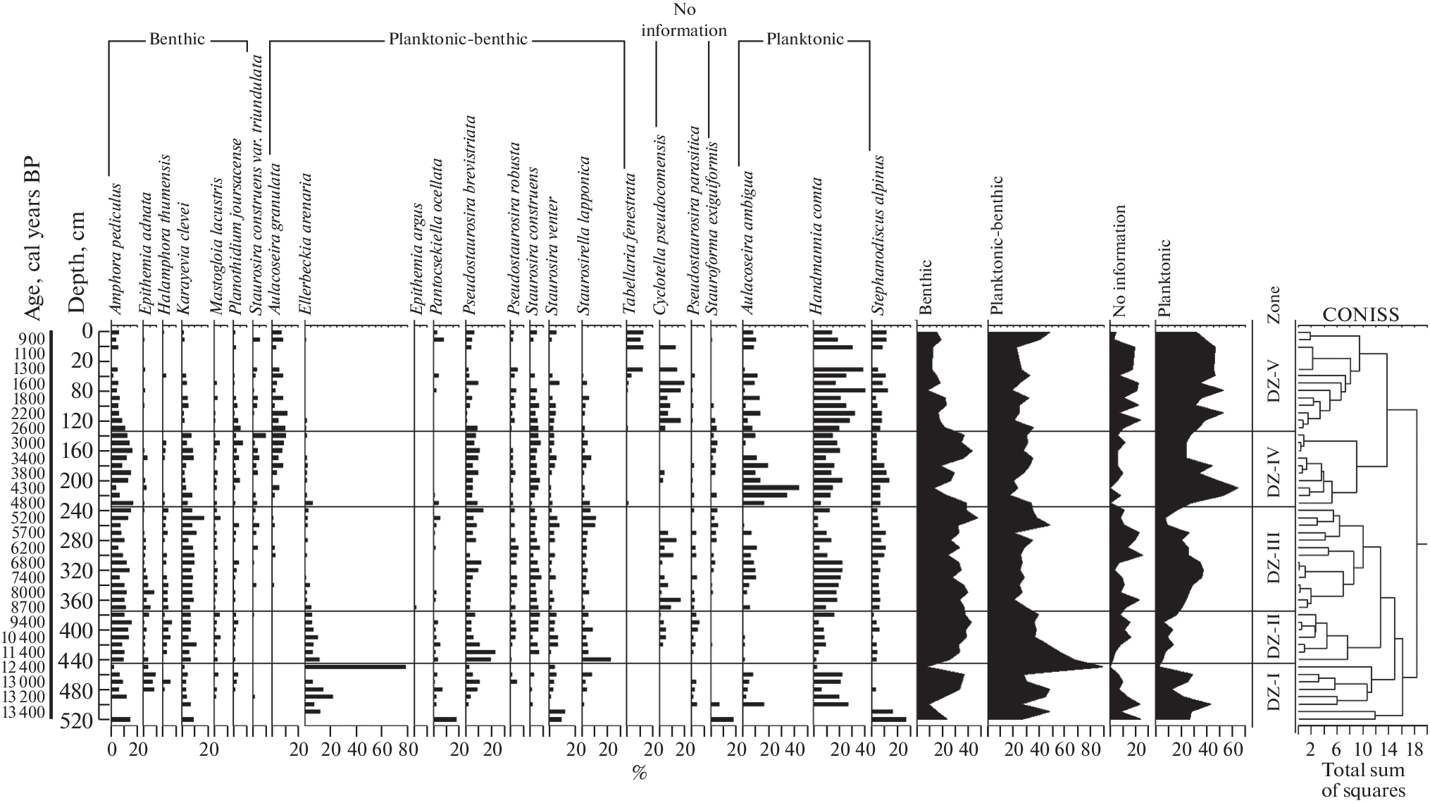 Bottom sediments are the most important “archive” containing information about the development of lake ecosystems. One of the most reliable and widely used methods of studying bottom sediments is diatom analysis (Juze et al., 1949). Currently, it is part of a group of guiding methods used to reconstruct the historical dynamics of the environment and climate (Rudaya et.al., 2012; Palagushkina et.al., 2018). In this work, the history of development of Lake Bolshoe Miassovo (Southern Urals) reconstructed using the taxonomic composition of diatoms found in the 526 cm long sediment core is presented. The maximum age of the sediments in the column was 13 500 years BP. According to the results of the study, 123 taxa of diatoms belonging to 47 genera were identified in the lake sediments. Diatom analysis of the bottom sediments of the studied lake allowed us to identify the main stages of the evolution of the reservoir during the Late Glacial and Holocene. During ~13 200–11 700 yr BP, in the period of a cool climate, the lake was a deep body of water with a constant water level and an extensive zone of shallow waters overgrown with macrophytes; then ~11 700–8500 cal. years BP against the background of cooling, the water level decreased; from ~8500–4600 cal. years BP was the stage of increasing water level in the lake in a warmer and wetter climate; in the period ~4600–2500 cal. years BP there was an increase in productivity of algal communities; during ~2500–800 cal. years BP against the background of decreasing temperature, a deep lake with low mineralized water, and presence of swampy shallow waters with acidification processes in them is finally formed.