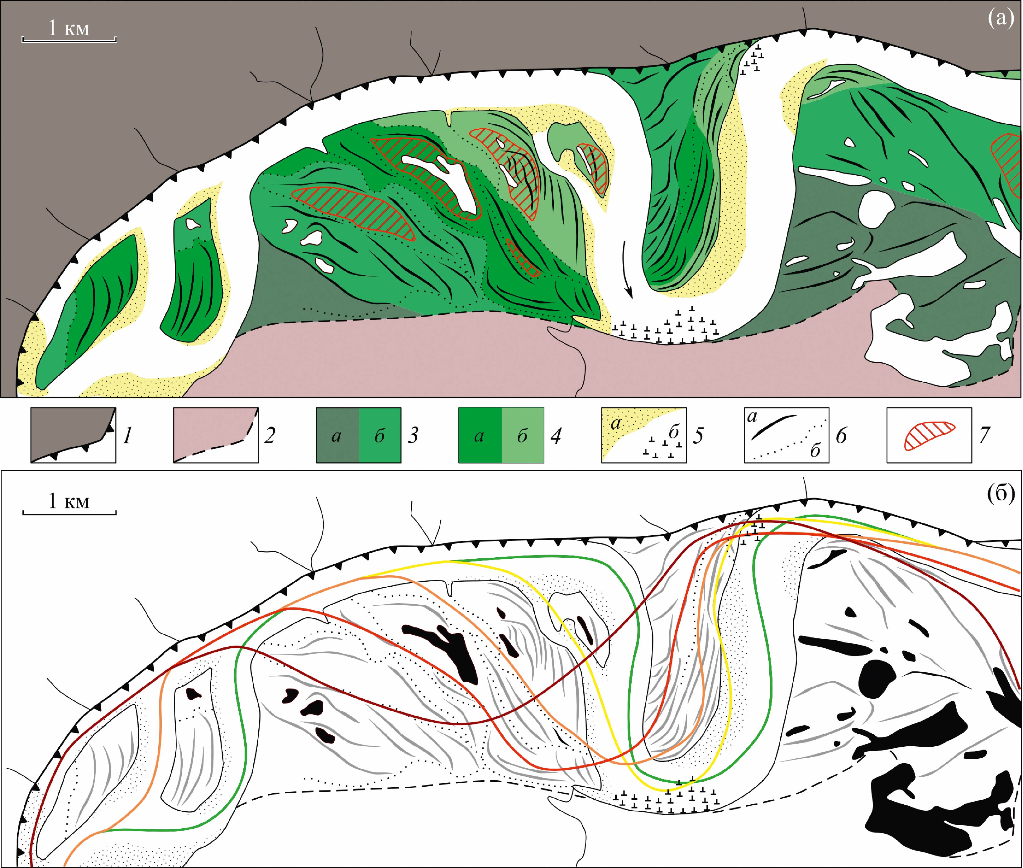 Fig. 2. (а) — Geomorphological scheme of the “Porogi” site within the intermountain basin. 1 — 4th Middle Pleistocene high-basement terrace and its ledge to the river; 2 — 3rd and 2nd Late Pleistocene basement terraces; 3а — 1st terrace (“floodplain–terrace”), 3б — high floodplain; 4 — regularly flooded young floodplain (а — medium, б — low); 5а — near-channel shoals, 5б — rock outcrops in the channel; 6а — meander scars, 6б — floodplain gullies; 7 — contours of former islands in the floodplain relief. (б) — Reconstruction of the sequential channel positions (along the flow axis) during the floodplain formation on the “Porogi” site (the color changes from burgundy to green with floodplain age decreasing).