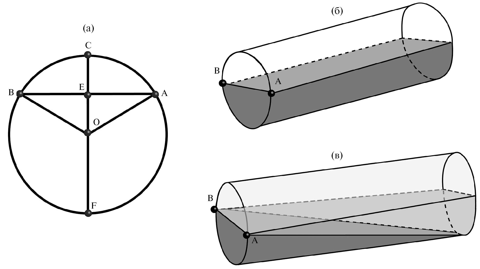 Подсчет объема наносов был выполнен Г.Д. Эмдиным в приложении WolframAlpha. Коллектор представляет собой простую геометрическую фигуру — цилиндр (рис. 3). Объем накопившегося осадка, таким образом, может быть рассчитан как произведение длины и площади сегмента круга, ограниченного хордой (поверхностью техноаллювия). При этом, учитывая почти идеальную выдержанность техноаллювиальной толщи, нет необходимости построения более сложной интегральной функции.