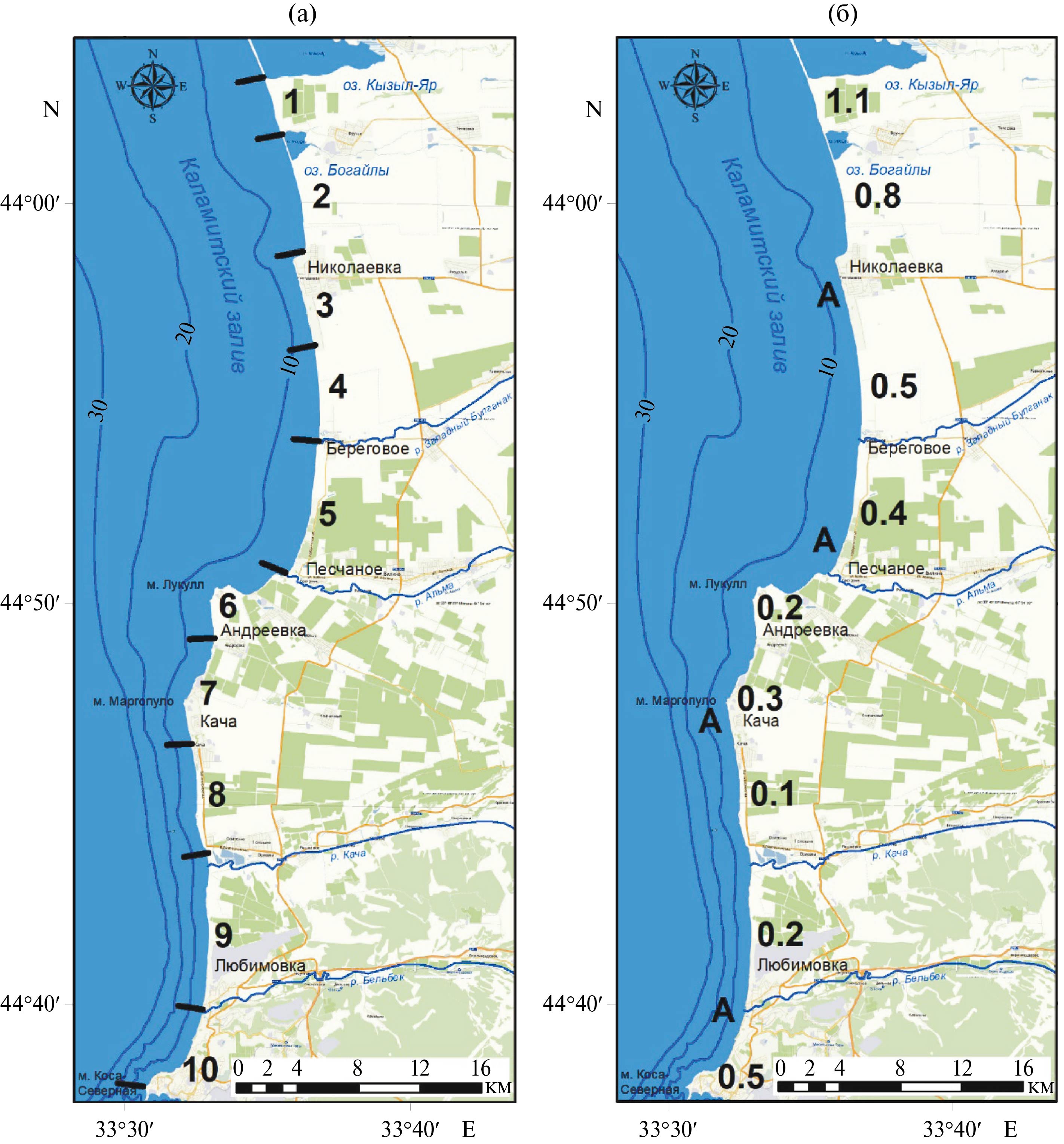 Рис. 1. Картосхема Западного Крыма (а), цифрами отмечены номера участков и типичные среднемноголетние значения отступания клифов, м/год (б), индексом А отмечены участки побережья, где клифы были террасированы.