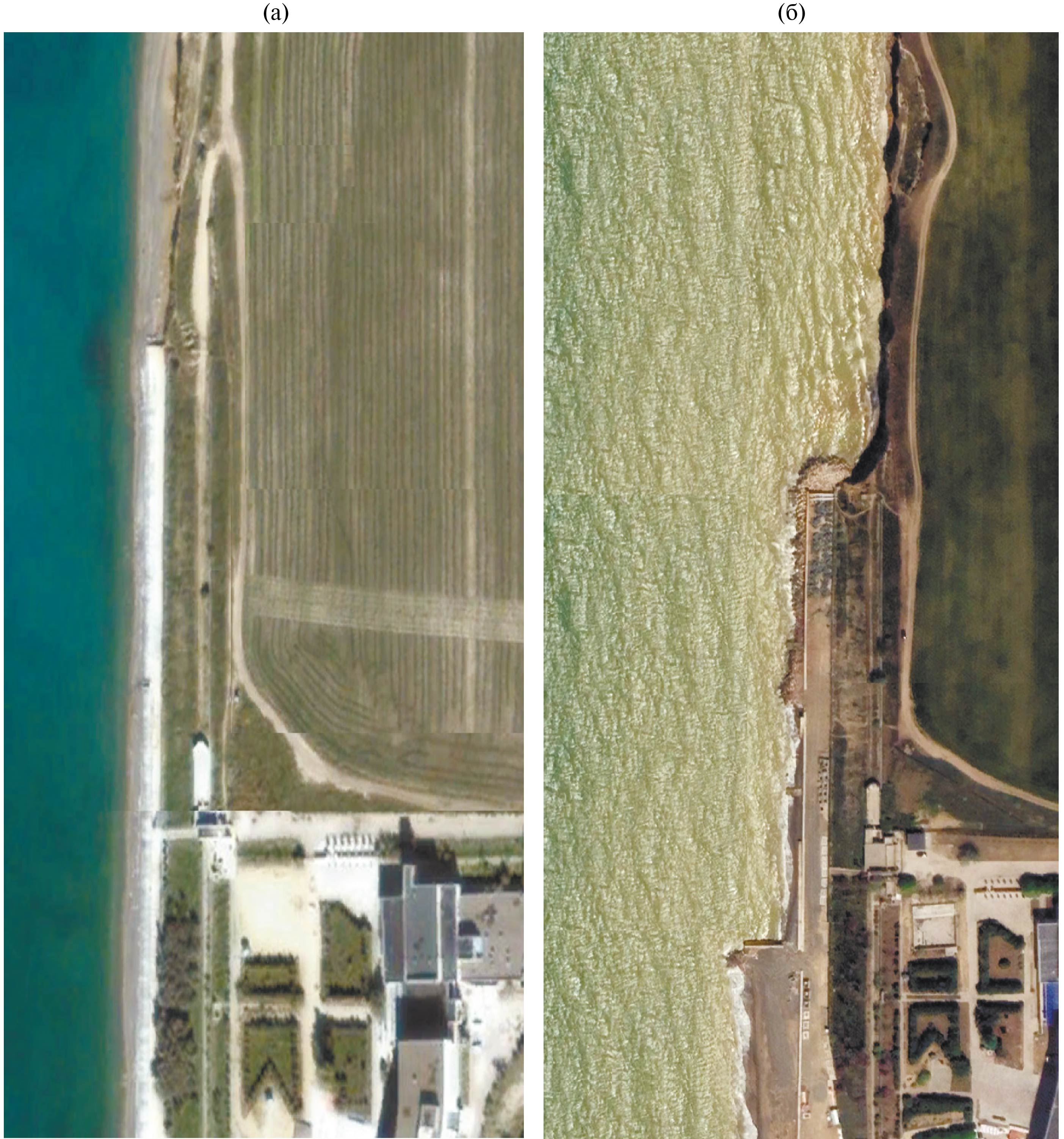 Fig. 4. Satellite imagery of the seafront area in the village of Beregovoe: (а) — October 2004, (б) — May 2021.