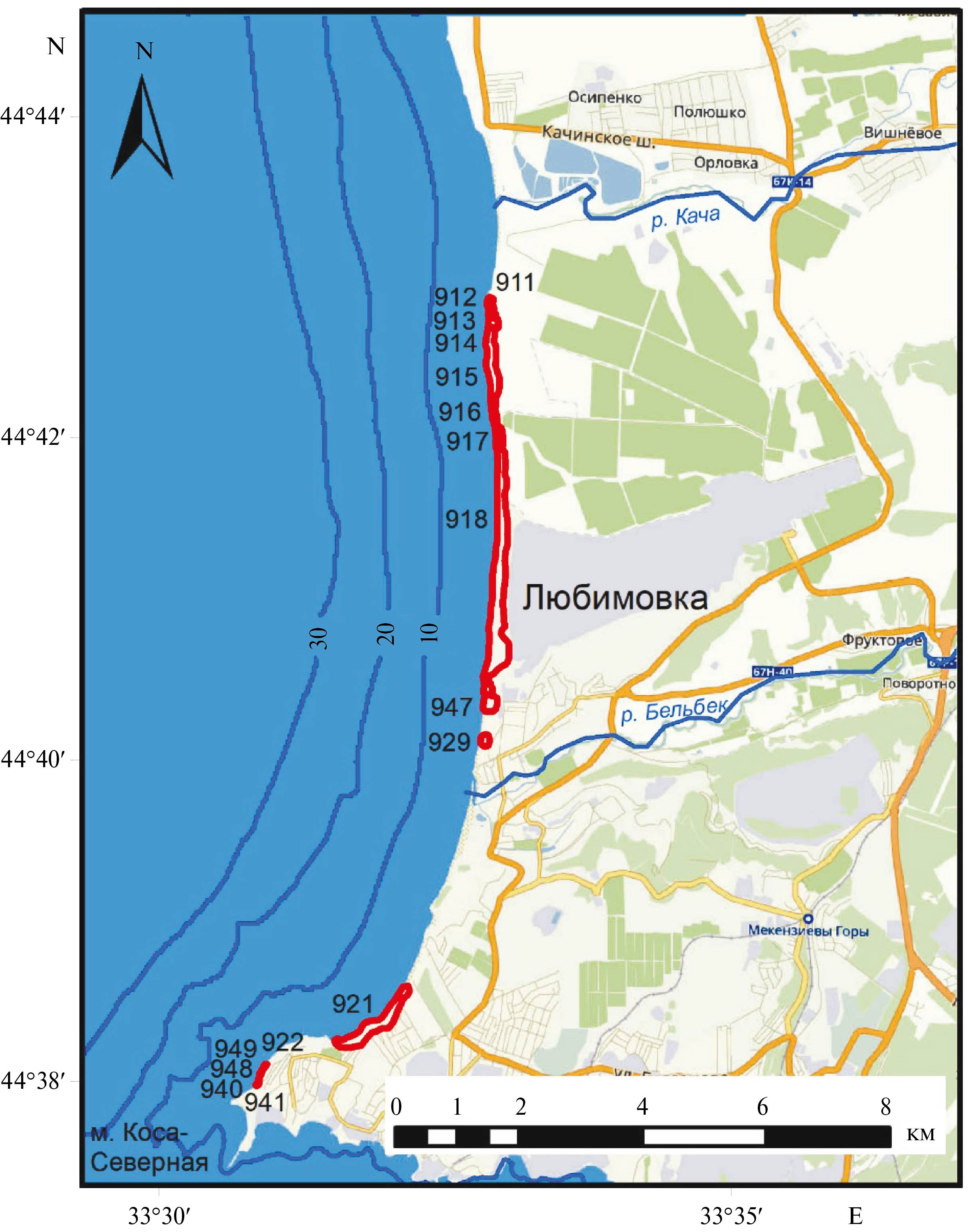 Участок 9 (от устья р. Кача до устья р. Бельбек) протяженностью 6.7 км. Если на выше рассмотренных участках главной причиной отступания клифов являются обвалы, то на двух последних участках основной механизм — оползневая деятельность. Оползни развиваются в средне- и верхнеплиоценовых желто-бурых и красно-бурых глинах, в которых имеются редкие линзы песчаников и галечников. Основной причиной активизации оползней, фронтальных в плане и ступенчатых на профиле, является абразия. Она не только поддерживает неустойчивость склона, но и приводит к росту напряжений в прибровочной части клифа. На рассматриваемом участке зафиксировано 10 оползней (рис. 6). Восемь из них относительно небольшие, площадью от 4 до 10 тыс. м2, длиной по фронту от 70 до 200 м. Наблюдения за динамикой оползней проводятся с конца 70-х гг. ХХ в. Средние скорости отступания бровки приведены в табл. 1. Они относительно невелики: 0.1—0.3 м/год, вместе с тем максимальные подвижки могут достигать 3.5 м/год.