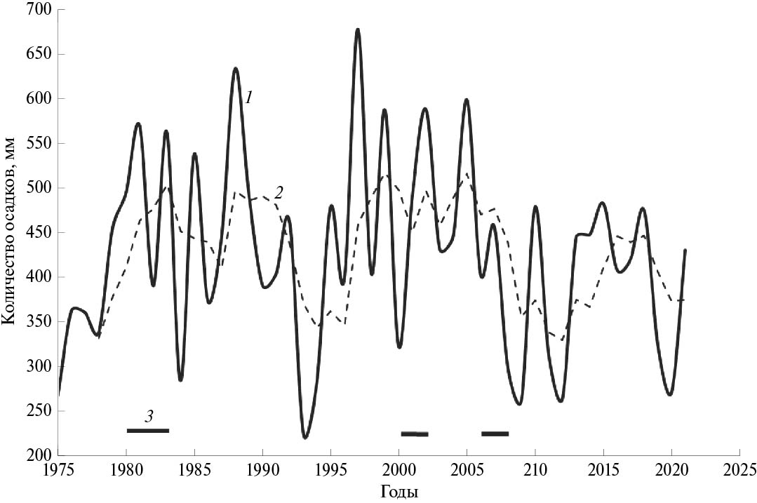 Рис. 7. Межгодовая изменчивость количества осадков (мм) по данным морской гидрометеостанции Севастополь (1), сглаживание скользящей средней за 4 года (2) и периоды активизации оползней (3).
