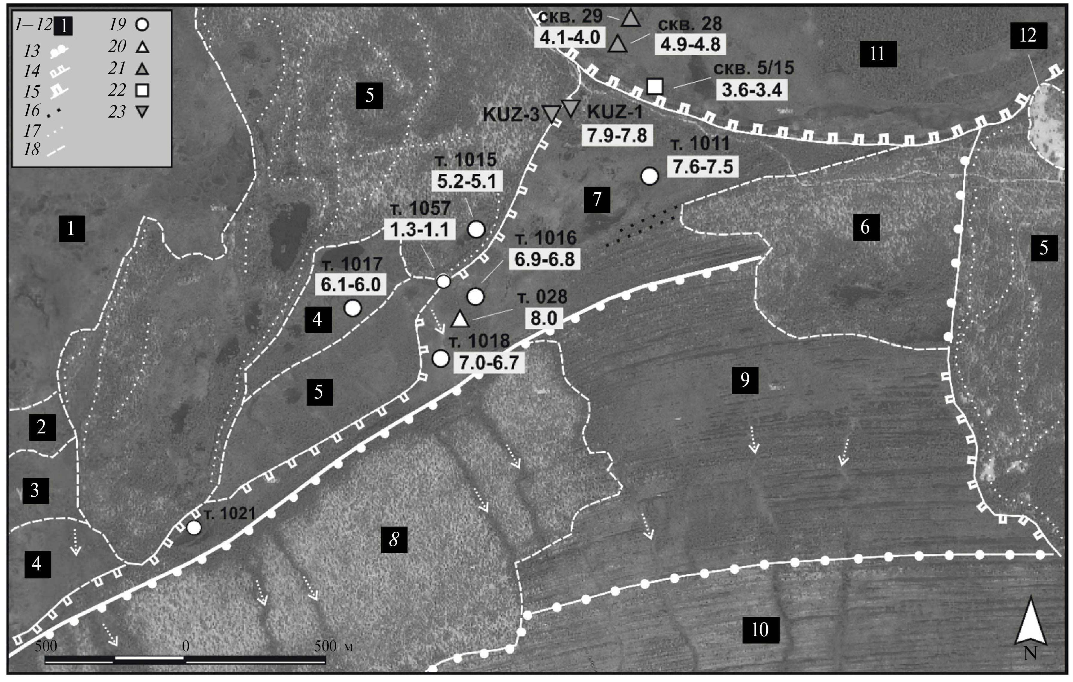 Исследования были организованы по полимасштабному принципу. В нижнем течении р. Варзуги по дистанционным данным были уточнены региональный морфоструктурный план и пространственное положение выделенных ранее (Кошечкин и др., 1973; Hättestrand et al., 2007) древних береговых линий (рис. 1, (б)), а в устье реки проведены комплексные полевые исследования (рис. 1, (в)). Детальные работы были сосредоточены в районе контакта террас и коренного берега, приуроченного к зоне сопряжения морфоструктурных блоков, где ранее были установлены значительные различия времени начала накопления торфа, а генезис рельефа интерпретировался неоднозначно (Зарецкая, Репкина, 2015; Агафонова и др., 2020; Тимирева и др., 2022).