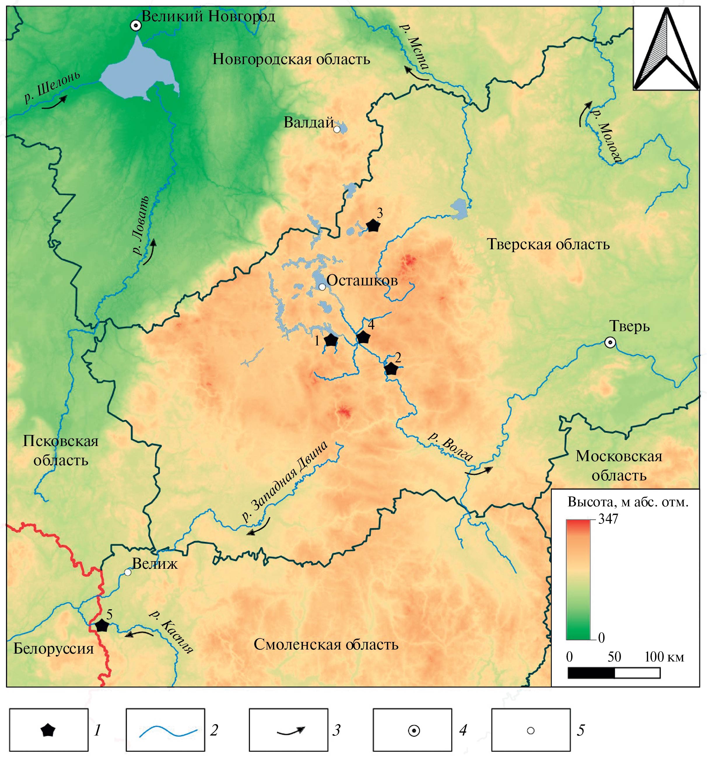 Fig. 1. Location of the studied sections. 1 — section (1 — “Bolshaya Dubenka”, 2 — “Malaya Kosha”, 3 — “Granichnaya”, 4 — “Kileshino-2”, 5 — “Nizhnyaya Boyarshchina”); 2 — hydrological network; 3 — direction of the river flow; 4 — administrative center; 5 — settlement.
