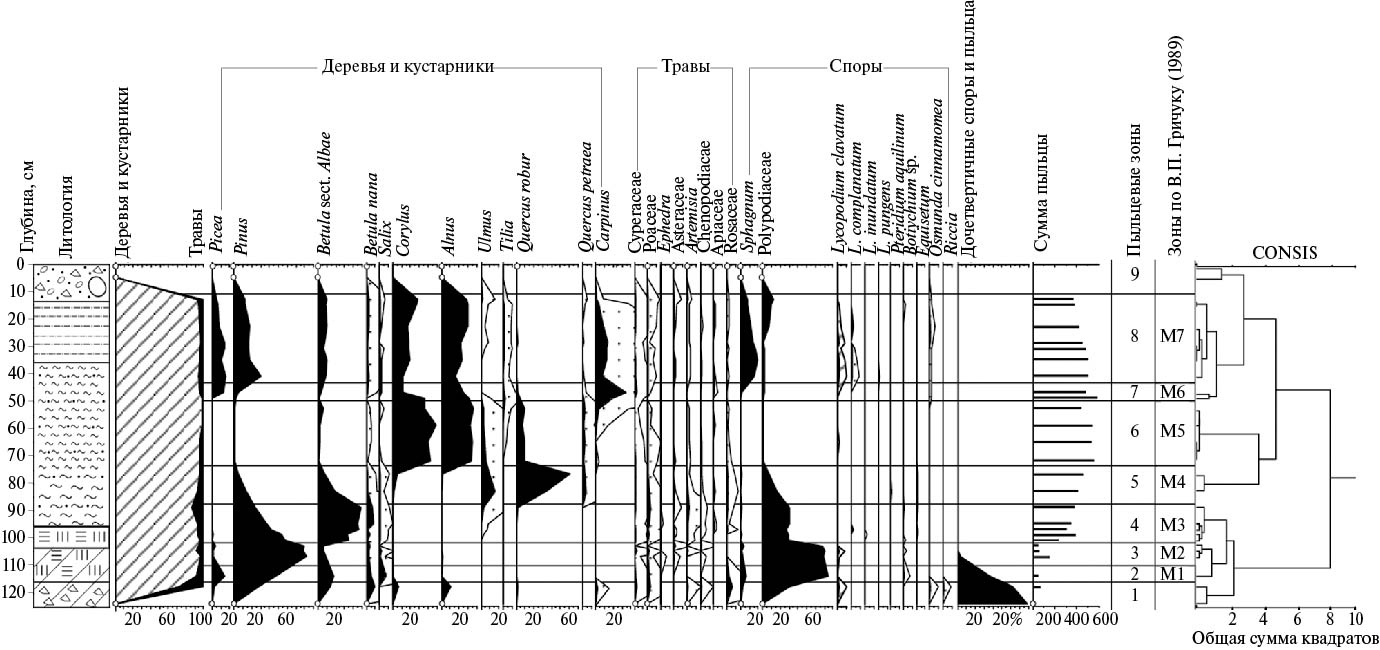 Сопоставление полученных данных с результатами предыдущих исследований отложений на р. Большая Дубенка (Чеботарева и др., 1961; Ананова и др., 1973) выявило сходство полученных спорово-пыльцевых спектров с этапами развития растительности микулинского межледниковья (зоны М1–М7).