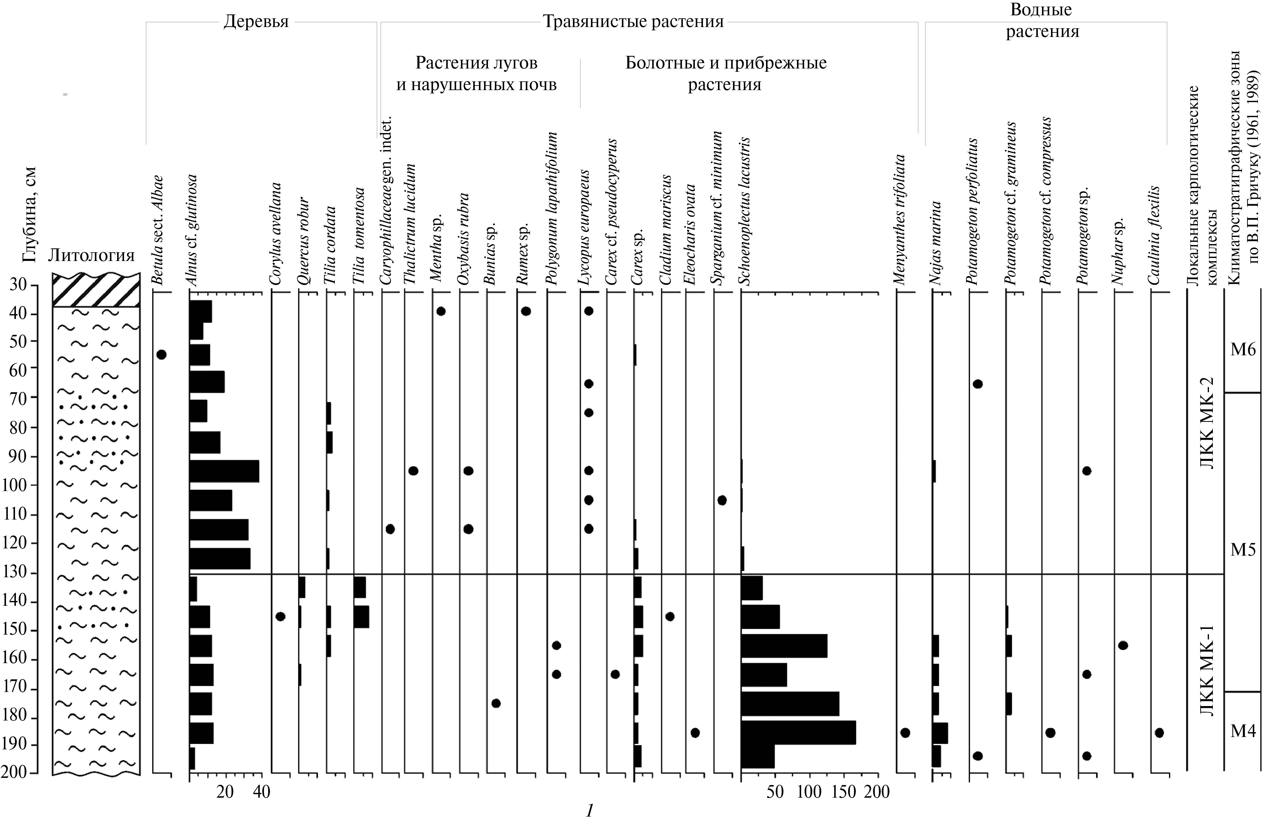 Сопоставление палеокарпологических и палинологических данных (рис. 3) показало, что локальные карпологические комплексы (ЛКК) разреза “Большая Дубенка” относится к верхней части пыльцевой зоны М2, зоне М3 и началу зоны М4, т.е. к начальному этапу микулинского межледниковья. Подобные ЛКК известны из других разрезов верхнего плейстоцена на территории Тверской области, как из отложений начальных или завершающих фаз микулинского межледниковья, так и из нижневалдайских интерстадиальных отложений (Величкевич, 1985; Zyuganova, 2009).