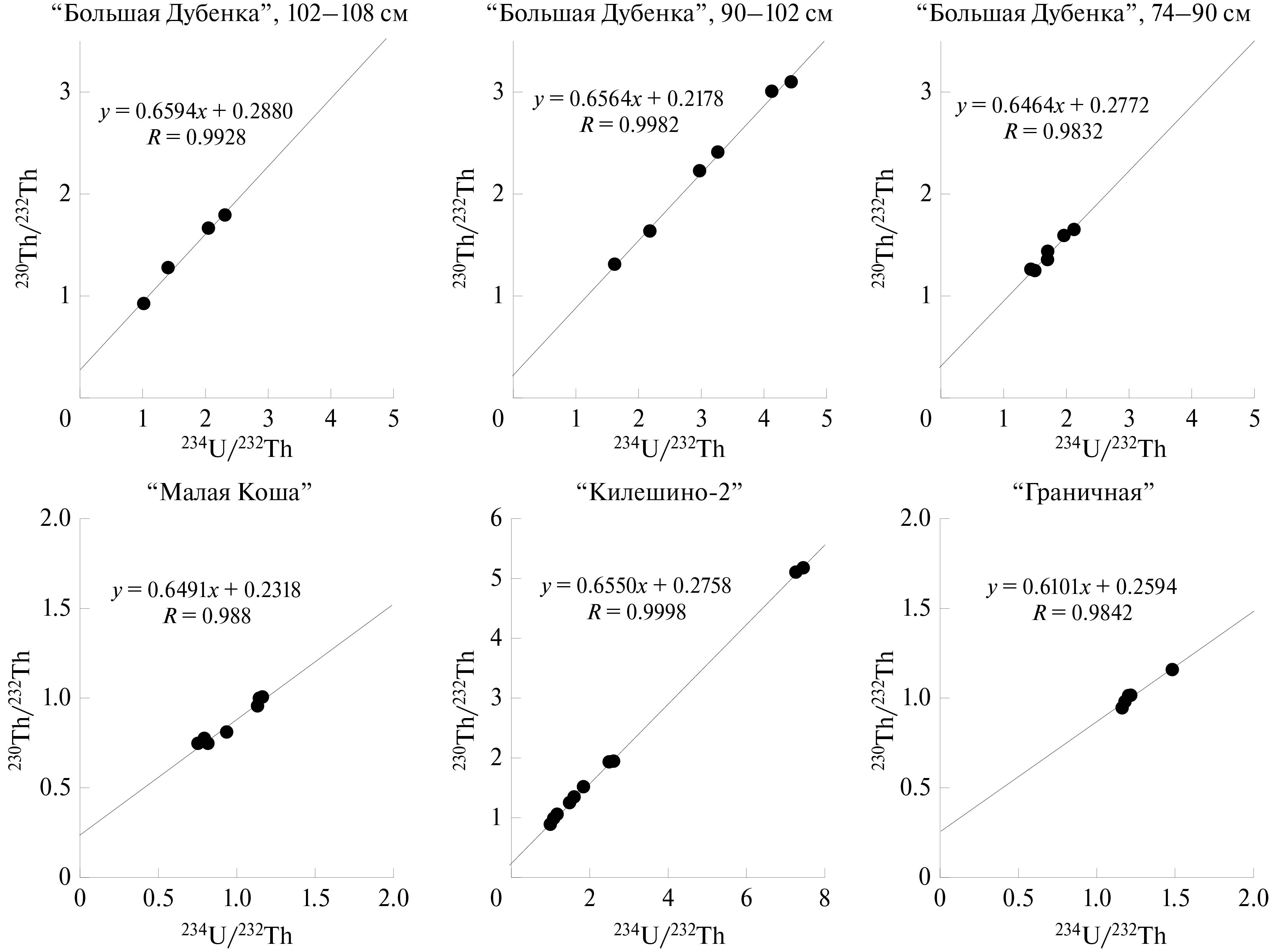 Надежность изохронных построений в той или иной степени зависит от размаха расположения точек вдоль линейных зависимостей. Поэтому, по возможности, для датирования выбирались участки вертикального профиля отложений с существенными вариациями значений отношения активностей ²³⁰Th/²³²Th.