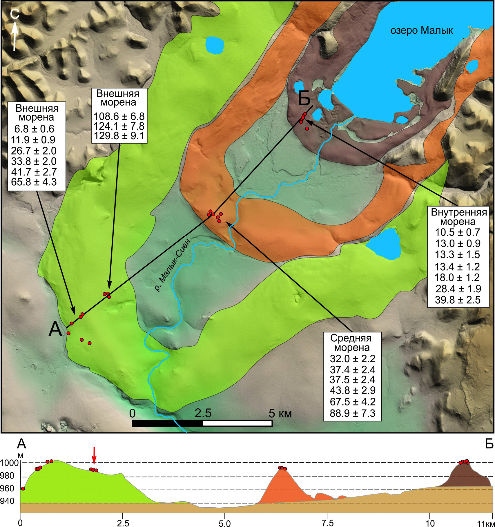 Рис. 4. Фрагмент долины р. Малык-Сиен с конечными моренами и места отбора проб (красные точки). Прямоугольники показывают возраст экспонирования моренных валунов. В нижней части рисунка представлен продольный топографический профиль с конечно-моренными валами, на которых показаны высоты мест отбора проб. Красная стрелка на внешней морене указывает на ключевые образцы MS-M15B-1, MS-M15B-2 и MS-M15B-3, положение которых в постседиментационный период было более стабильным
