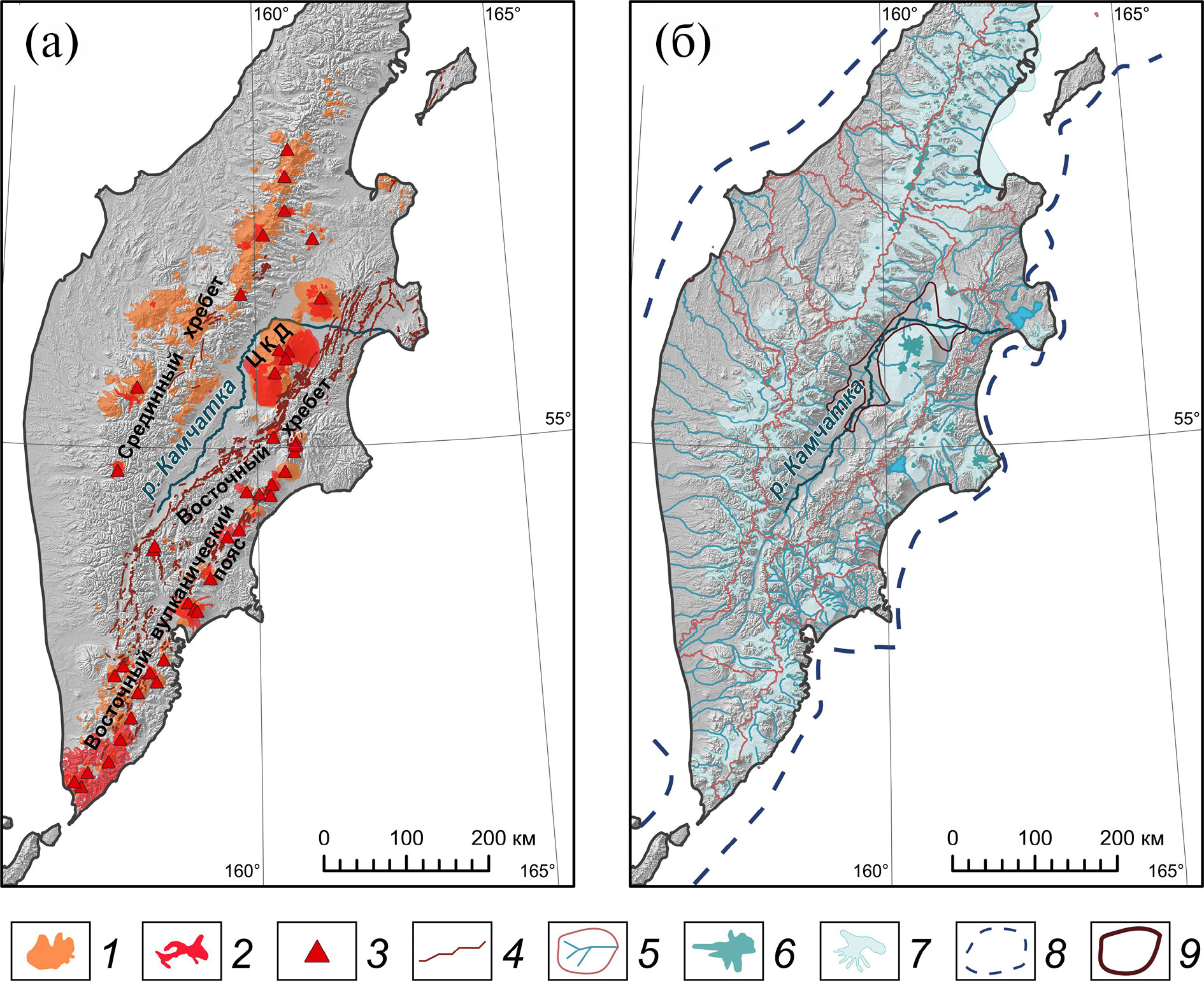 Fig. 1. Spatial distribution of major geomorphic processes. (а) – endogenic: 1 – Late Quaternary volcanic deposits (Ponomareva et al., 2007); 2 – Holocene volcanic deposits and 3 – eruption centers (GIS “Holocene volcanism of Kamchatka”, Romanova et al., 2015); 4 –Active faults (Kozhurin, Zelenin, 2017). (б) – exogenic: 5 – rivers and watersheds (https://www.hydrosheds.org/); glaciers: 6 – modern (Lynch et al., 2016), 7 – “Phase II” of the Late Pleistocene glaciation (Braitseva et al, 1968), likely corresponding to the global Last Glacial Maximum (Barr and Solomina, 2014); 8 – maximum extent of Pleistocene glaciations (Barr and Solomina, 2014); 9 – possible boundaries of the Late Pleistocene paleolake (Ponomareva et al., 2021)