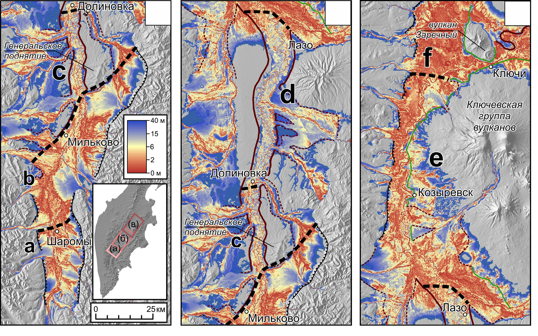 Рис. 3. Строение бассейна верхнего и среднего течения р. Камчатка. Пунктирными линиями показаны границы морфологически различающихся участков долины (a–f). Усл. обозначения см. рис. 2, (а)