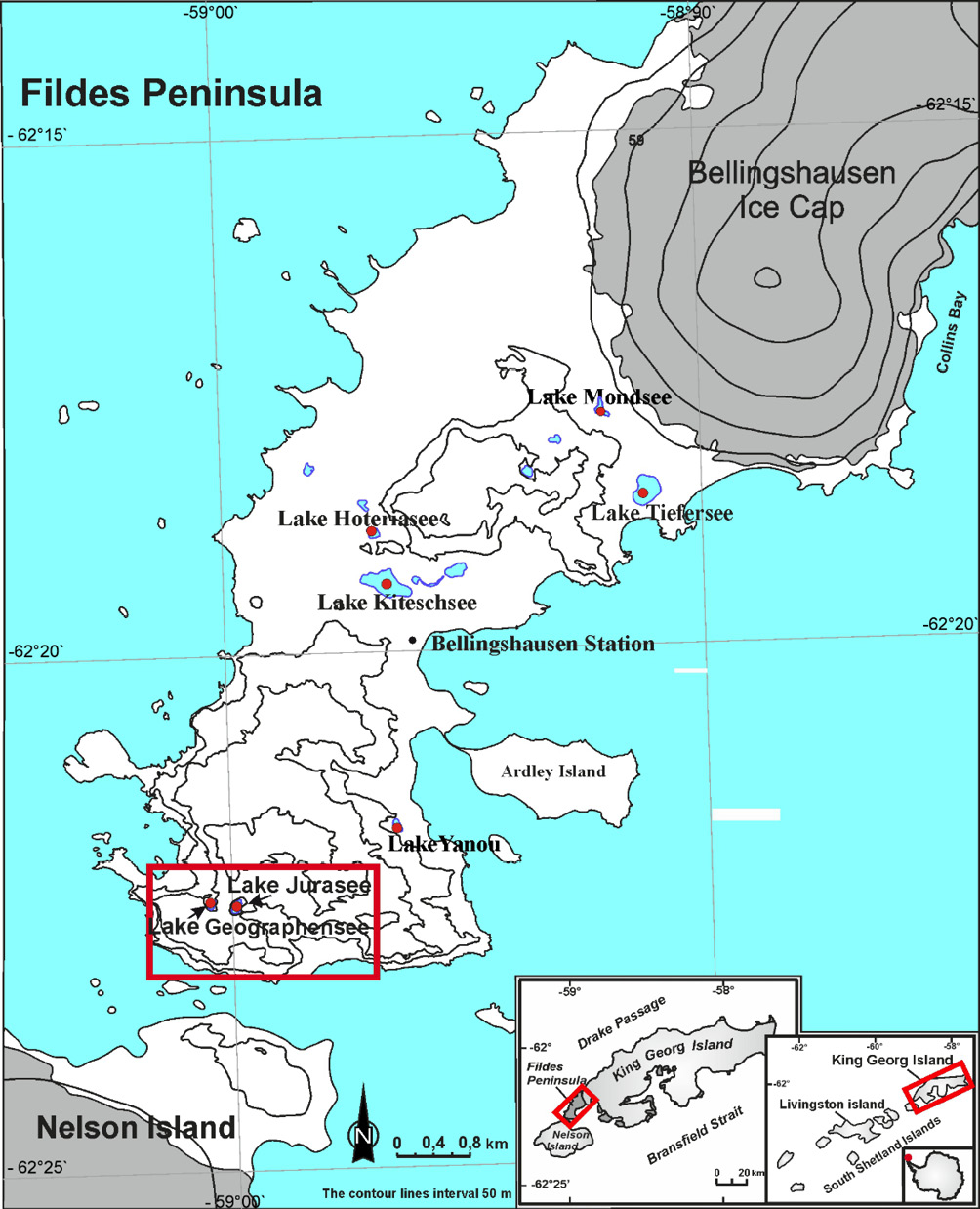 Fig. 1. Map of the research area on the Fileds Peninsula, King Georg Island, West Antarctica with locations of geographic objects mentioned in the text