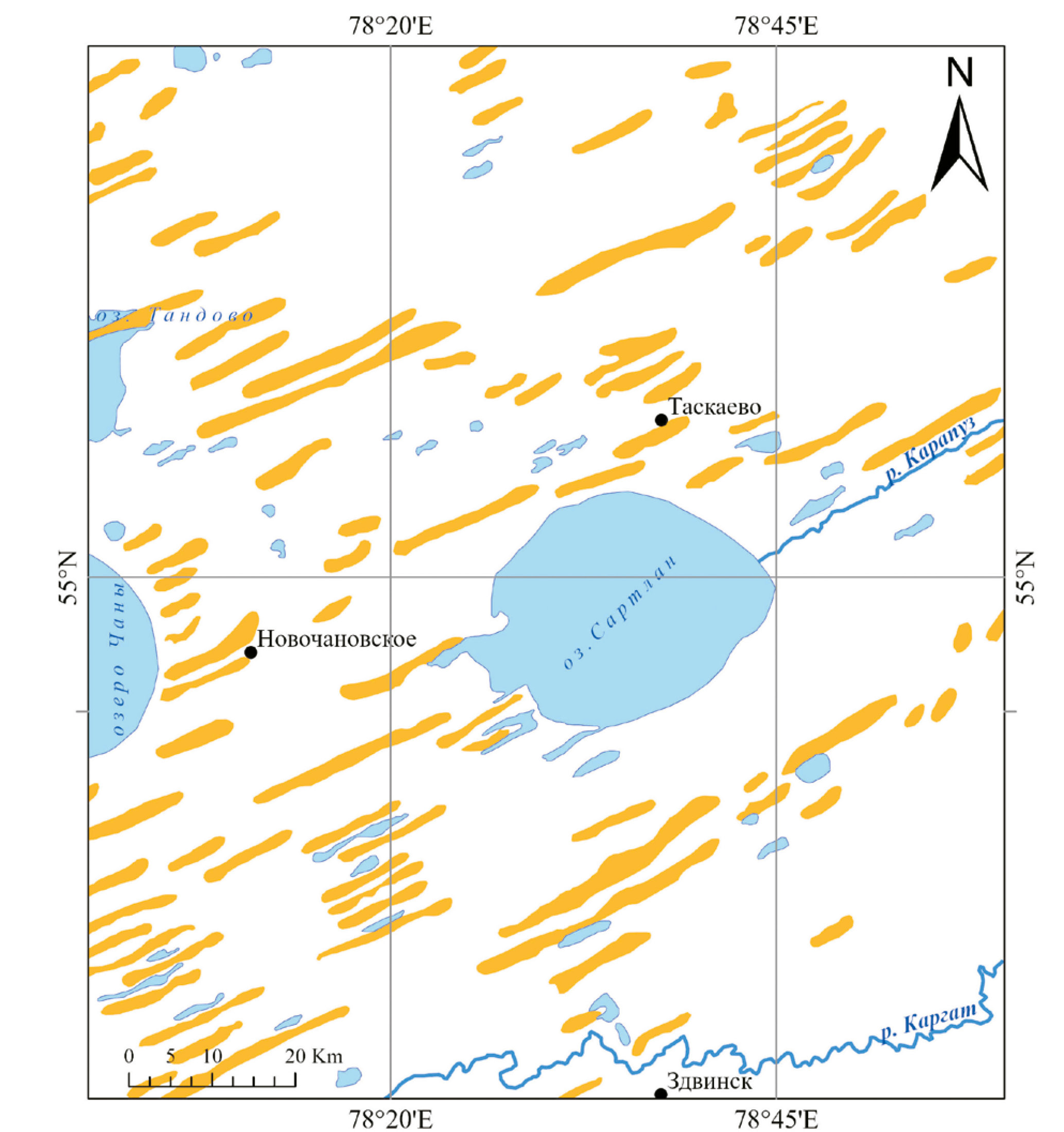 Fig. 4. The grivas relief of the Chany depression of the time of the last glaciation, composed of low longitudinal ridges (grivas) to the southwest winds.