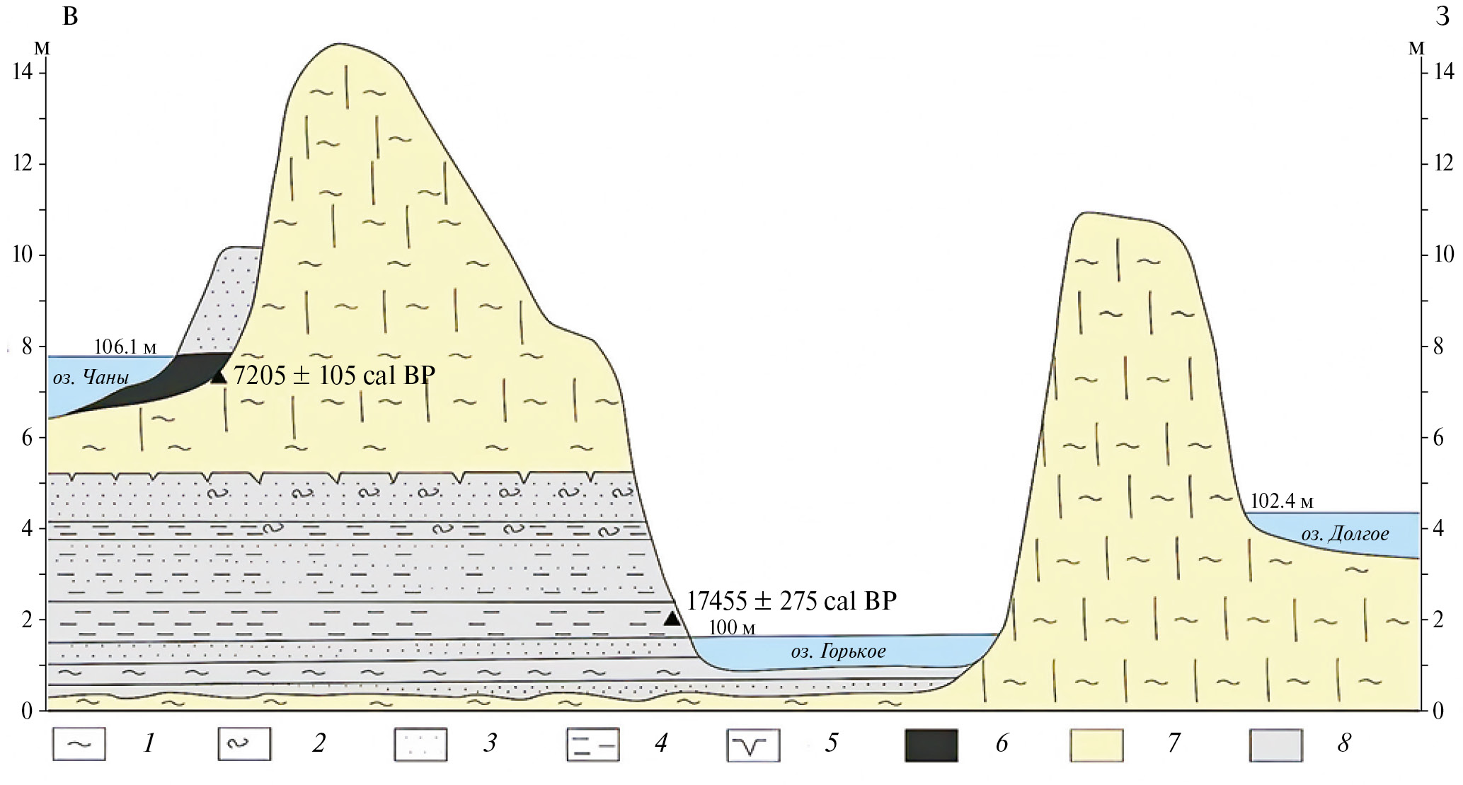 Рис. 5. Геологический разрез юго-восточного борта котловины оз. Чаны. 1 — суглинок; 2 — солифлюксий; 3 — песок; 4 — алеврит; 5 — мерзлотные клинья; 6 — погребенная почва; 7 — эоловые отложения; 8 — озерные отложения.