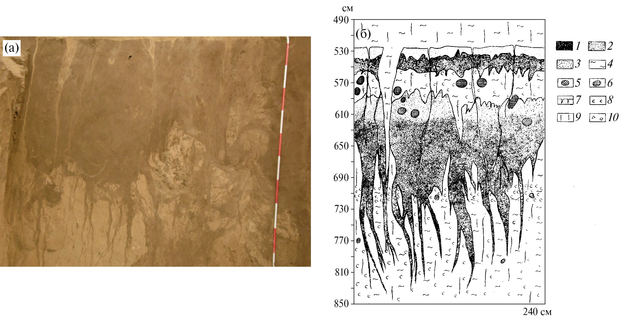 Рис. 8. Строение нижней почвы бердского педокомплекса (МИС 5 е): (а) — карьер Тогучин, (б) — карьер Ложок. Суглинок: 1 — сильно гумусированный, 2 — средне гумусированный, 3 — слабо гумусированный, 4 — лёссовидный; норы землероев: 5 — заполненные лёссовидным суглинком, 6 — заполненные гумусированным суглинком; 7 — трещины усыхания; 8 — псевдомицелий и пятна белоглазки; 9 — вертикальная трещиноватость; 10 — щебень.