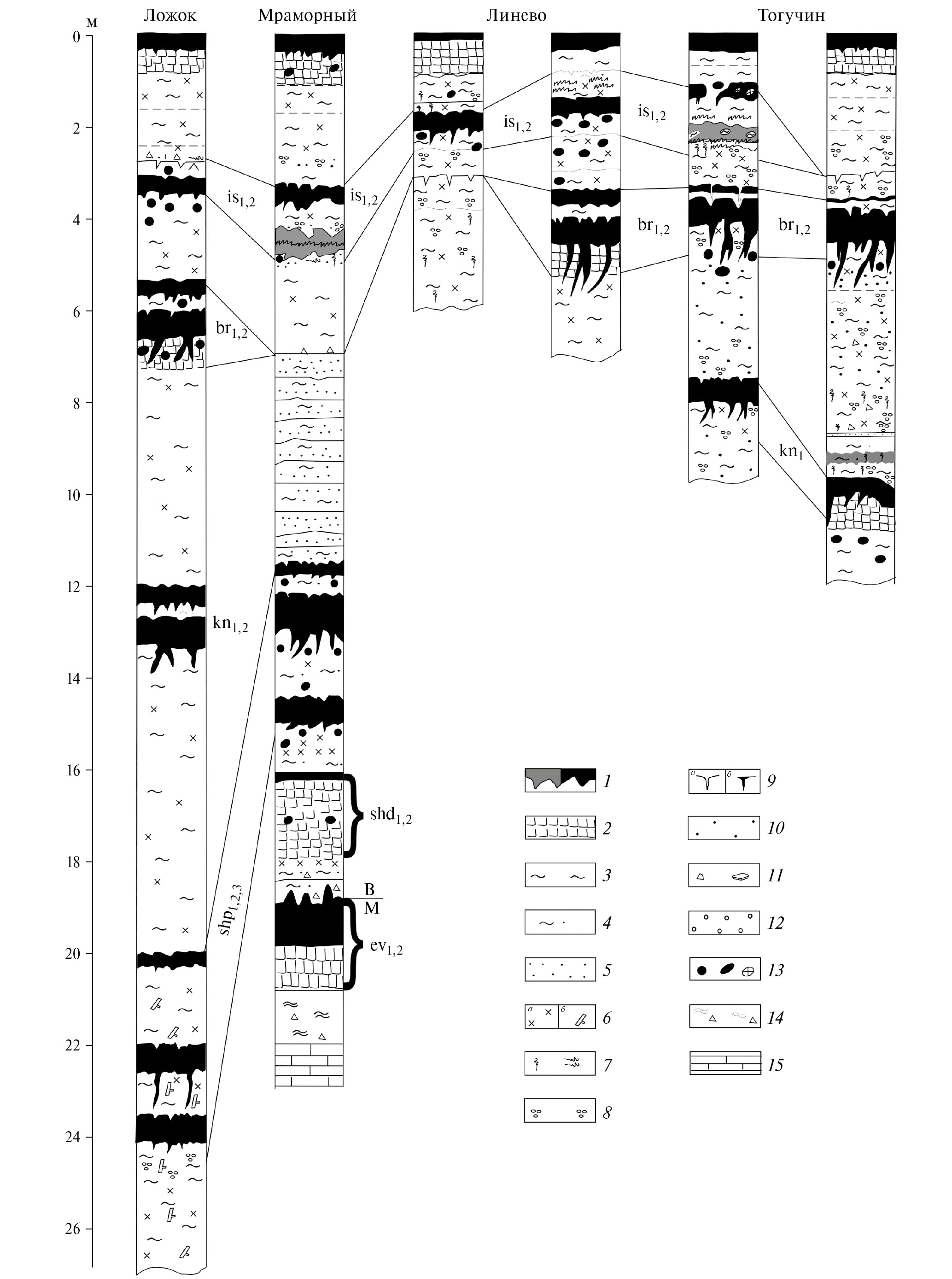 Рис. 9. Корреляция разрезов лёссово-почвенной последовательности плейстоцена Новосибирского региона. Горизонт почв: 1 — гумусовый, 2 — иллювиальный; 3 — алеврит; 4 — алеврит опесчаненный; 5 — Mn-крап; 6 — карбонаты (а) и карбонатные конкреции (б); 7 — новообразования Fe; 8 — оглеение; 9 — трещины усыхания (а) и гумусированные затеки (б); 10 — Fe–Mn-конкреции; 11 — мелкий щебень и пластинки сланцев; 12 — гравий;13 — норы землероев; 14 — кора выветривания; 15 — известняк.