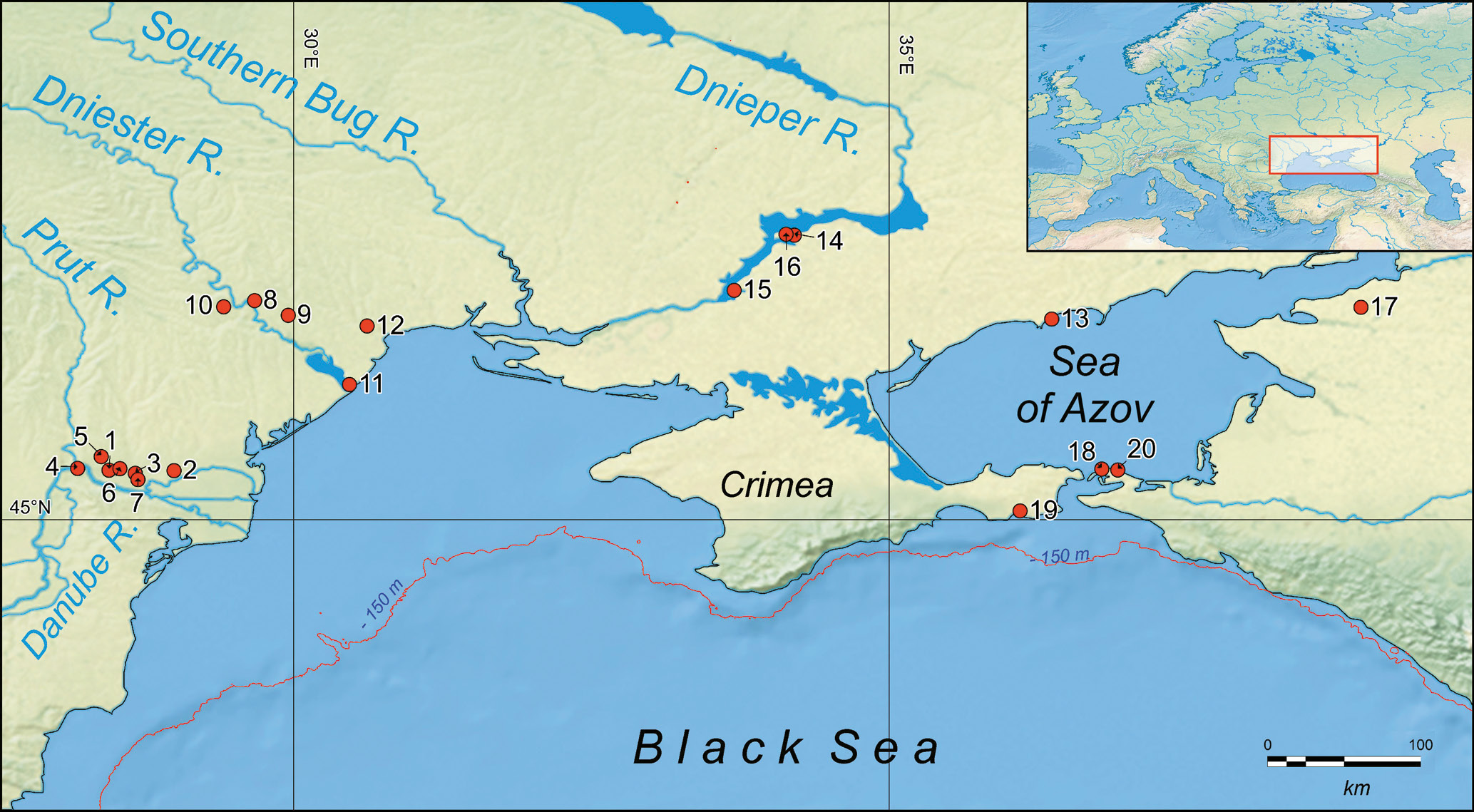 Рис. 1. Местонахождения плейстоценовых мелких млекопитающих, упоминаемые в тексте. 1 — Нагорное, 2 — Суворово, 3 — Озерное (Бабель), 4 — Узмари, 5 — Чешмикиой, 6 — Плавни, 7 — Новонекрасовка, 8 — Колкотова Балка, 9 — Левада, 10 — Хаджимус, 11 — Роксоланы, 12 — Черевичное 1 (Морозовка), 13 — Ногайск (Приморское), 14 — Карай-Дубина (Бережанка), 15 — Западные Каиры, 16 — Ушкалка, 17 — Порт-Катон, 18 — Литвин, 19 — Узунлар, 20 — Пекла.