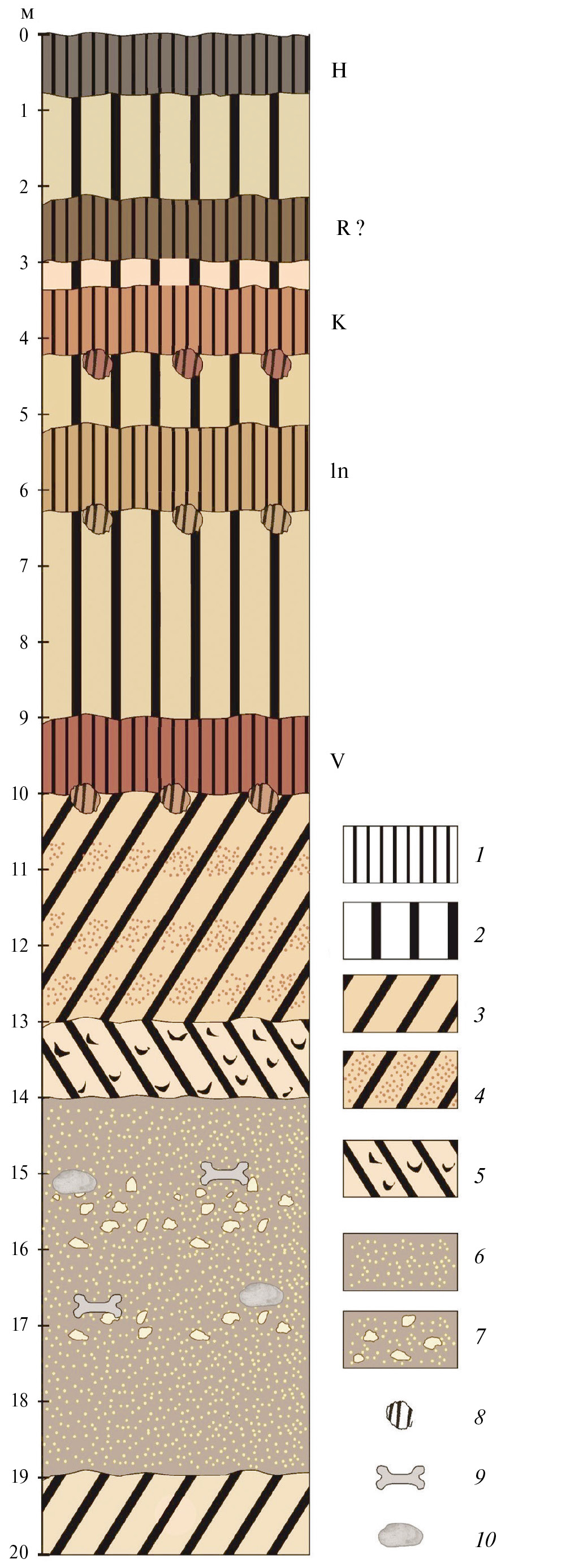 К началу позднего плейстоцена была отнесена фауна из двух близко расположенных горизонтов лиманных отложений II террасы Дуная в разрезе Новонекрасовка (восточный берег оз. Ялпуг) (рис. 1, 7). Местонахождения фауны мелких млекопитающих залегают непосредственно под горизонтом мезинской ископаемой почвы (рис. 4).