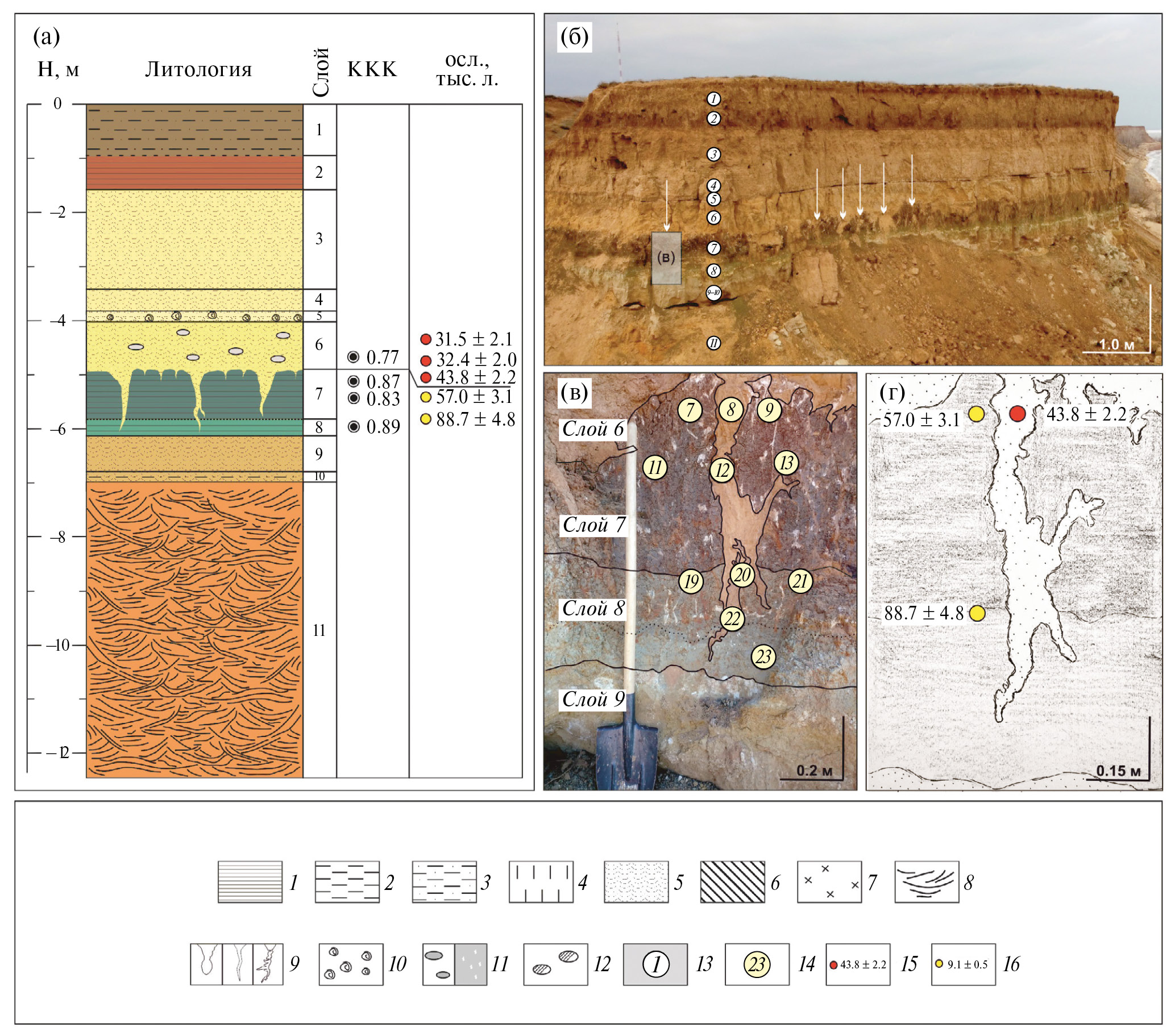 3. Fig. 2. Chernyy Yar section: (а) — the scheme of the — section with the coefficient of cryogenic contrast, OSL dating results, the color of the deposits reflects the natural color of the sediments; (б) — general view (white arrows show studied structures); (в) — sampled structure (numbers indicate sampling points for lithological analysis); (г) — sketch of the sampled structure with the results of OSL dating. 1 — clay; 2 — loam; 3 — sandy loam; 4 — loess; 5 — sand; 6 — redeposited sediment; 7 — paleosols; 8 — stratification; 9 — cryogenic-like structures; 10 — malacofauna; 11 — carbonates (concretions and admixtures); 12 — krotovinas; 13 — layers numbers; 14 — sampling points for lithological analyses; 15 — OSL age, ka (structures filler and overlying sediments); 16 — OSL age, ka (enclosing sediments).