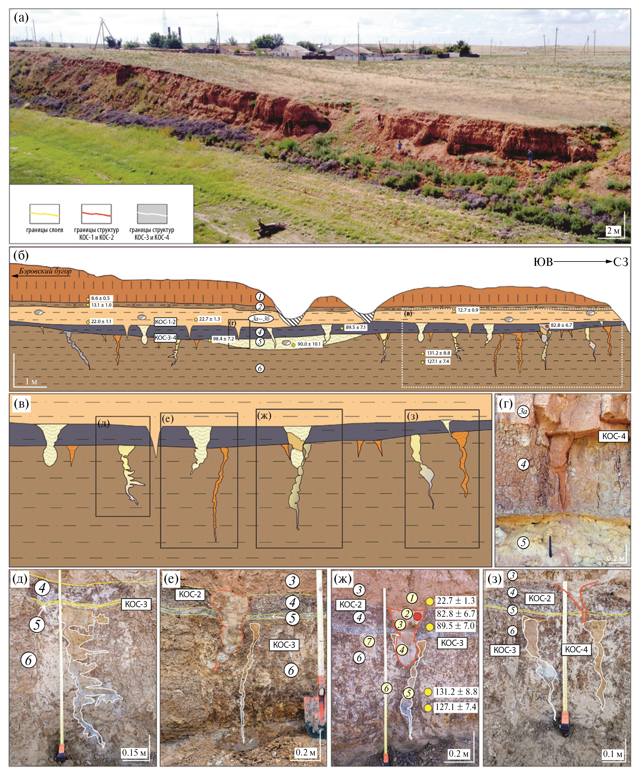 Рис. 3. Разрез Косика: (а) — общий вид; (б) — схема разреза (по Butuzova et al., с изменениями); (в) — фрагмент с рис. 3, (б); (г) — клиновидная структура горизонта КОС-1; (д) — структура горизонта КОС-3 с горизонтальными отростками; (е) — клиновидная, заполнена бежевым песком, структура горизонта КОС-2 (красный контур) и тонкая, длинная, заполнена рыжим песком (белый контур) структура КОС-4; (ж) — мешкообразная структура КОС-2 (красный контур), наложенная на структуру КОС-3, а также результаты датирования отложений; положение дат показано по горизонтам условно; (з) — структуры КОС-2 (красный контур), КОС-3 (слева, хвостовая часть сцементирована) и КОС-4 (справа), заполненные рыхлым песком. Цвет на схемах отражает естественный цвет осадка. Усл. обозначения на рис. 2.
