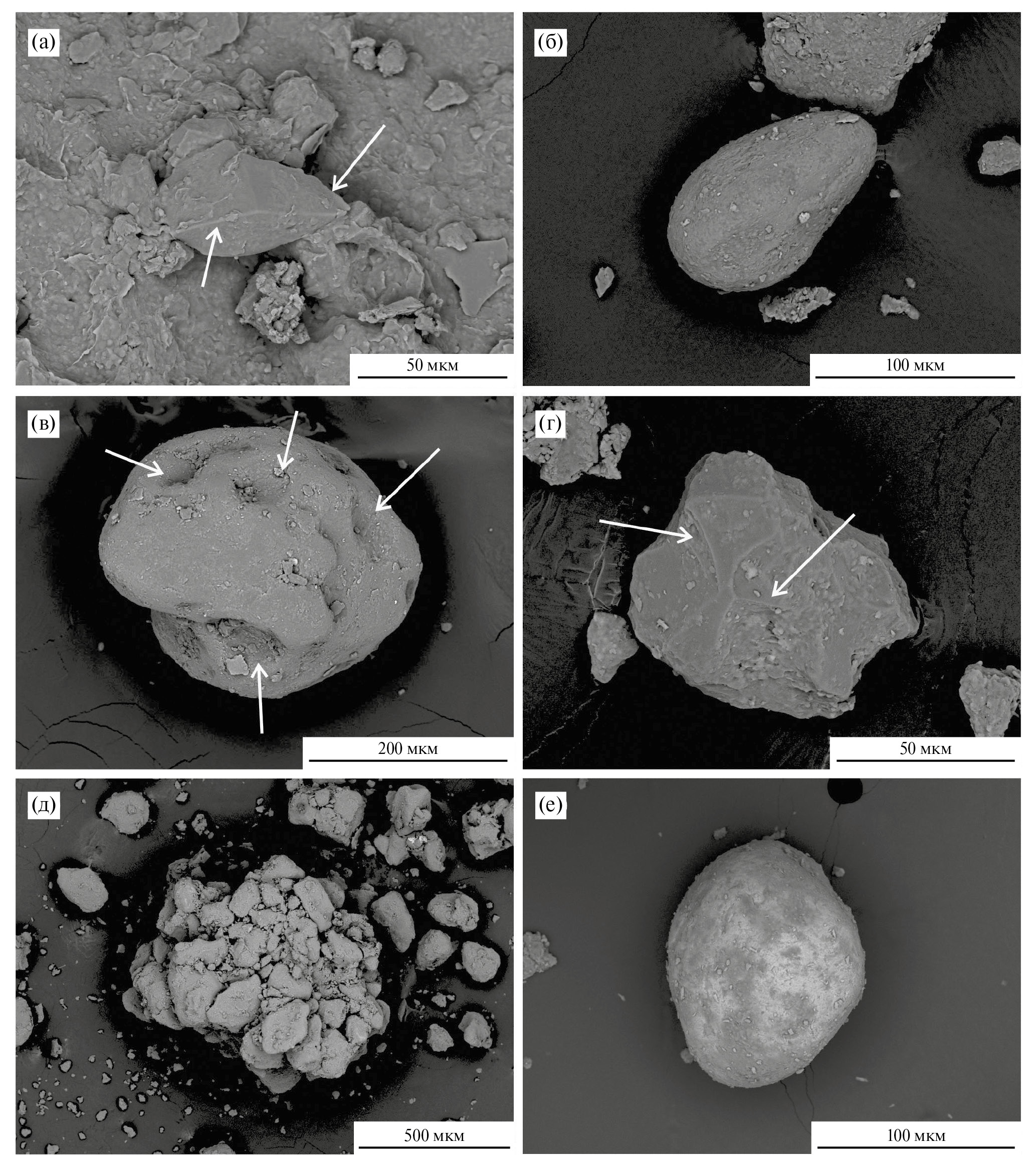 Морфология кварцевых зерен разреза Черный Яр верхней части слоя 7 (зона интенсивного преобразования) разнообразна: встречены угловатые частицы с раковистыми сколами (рис. 4, (а, б), параллельными бороздами (рис. 4, (в)), белые стрелки), свежими и сглаженными поверхностями (рис. 4, (в, г)); в то же время присутствуют изометричные окатанные зерна с поверхностью, покрытой многочисленными равномерно распределенными ямками, а также вытянутые зерна. На кварцевых частицах, помимо раковистых сколов, присутствуют следы травления (рис. 4, (д)).