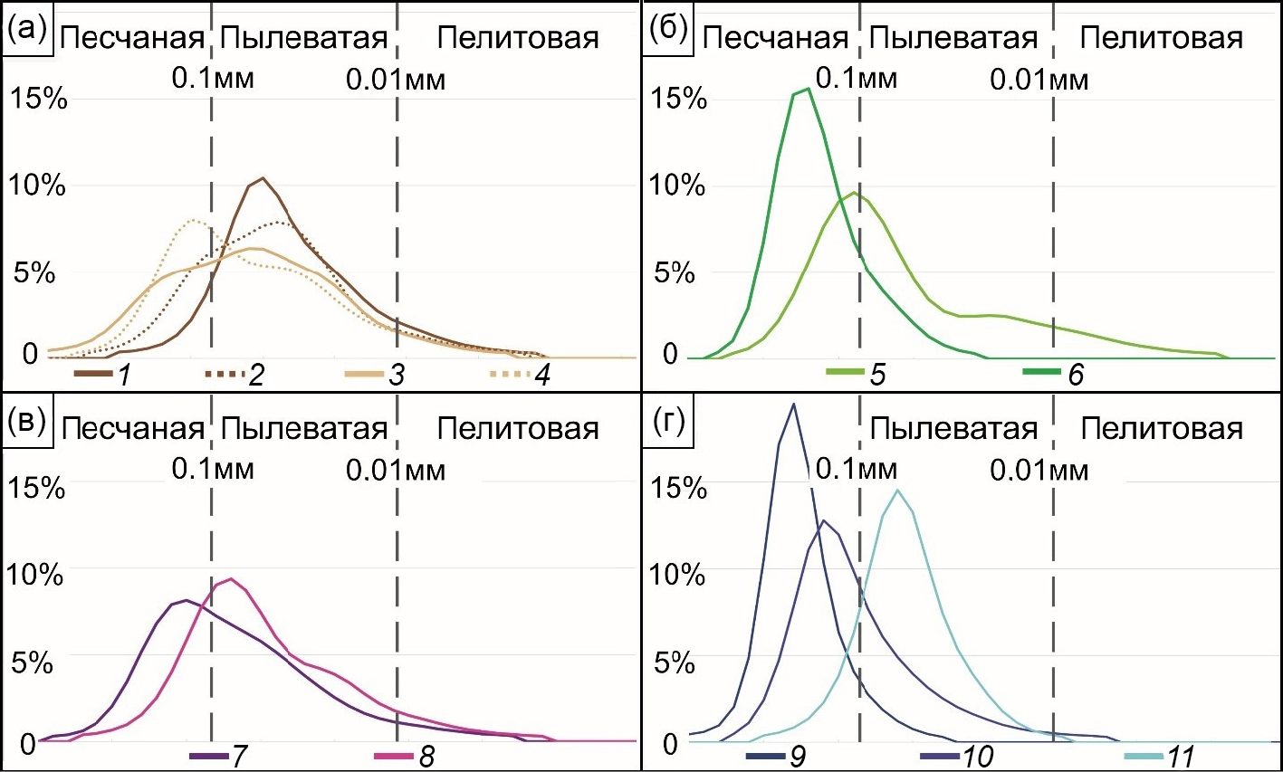 При полевых работах 2023 гг. в долине Среднего Енисея было отобрано более 200 образцов на гранулометрический анализ. Приведем примеры типовых гранулометрических кривых для рассматриваемых разновидностей отложений (рис. 3). Среди субаэральных образований классическим примером типичного лёсса является коричневый алеврит. На рис. 3, (а) видно, что его гранулометрическая кривая (1) имеет четко выраженный унимодальный характер с пиком на размере 0.05 мм, а основной объем частиц (более 80%) находится в интервале пылеватой (алевритовой) фракции: 0.1–0.01 мм. Гранулометрическая кривая (2) типичного коричневого делювия, залегающего в парагенезисе с коричневым лёссом, также показана на рис. 3, (а). Содержание алевритовой фракции в делювии около 70%, значительное количество частиц по сравнению с коричневым лёссом смещено в крупнопылеватую и песчаную фракции, за счет чего кривая становится менее симметричной. Также не симметричны кривые палевого лёсса (3 на рис. 3, (а); содержание алевритовой фракции около 60%) и палевого делювия (4 на рис. 3, (а); содержание алевритовой фракции около 50%), у которой максимум находится на границе между песчаной и пылеватой фракциями (0.1 мм). Таким образом, данными гранулометрического состава подтверждается полевое описание: коричневые лёссы и делювий являются типичными алевритами, а палевые более опесчанены.