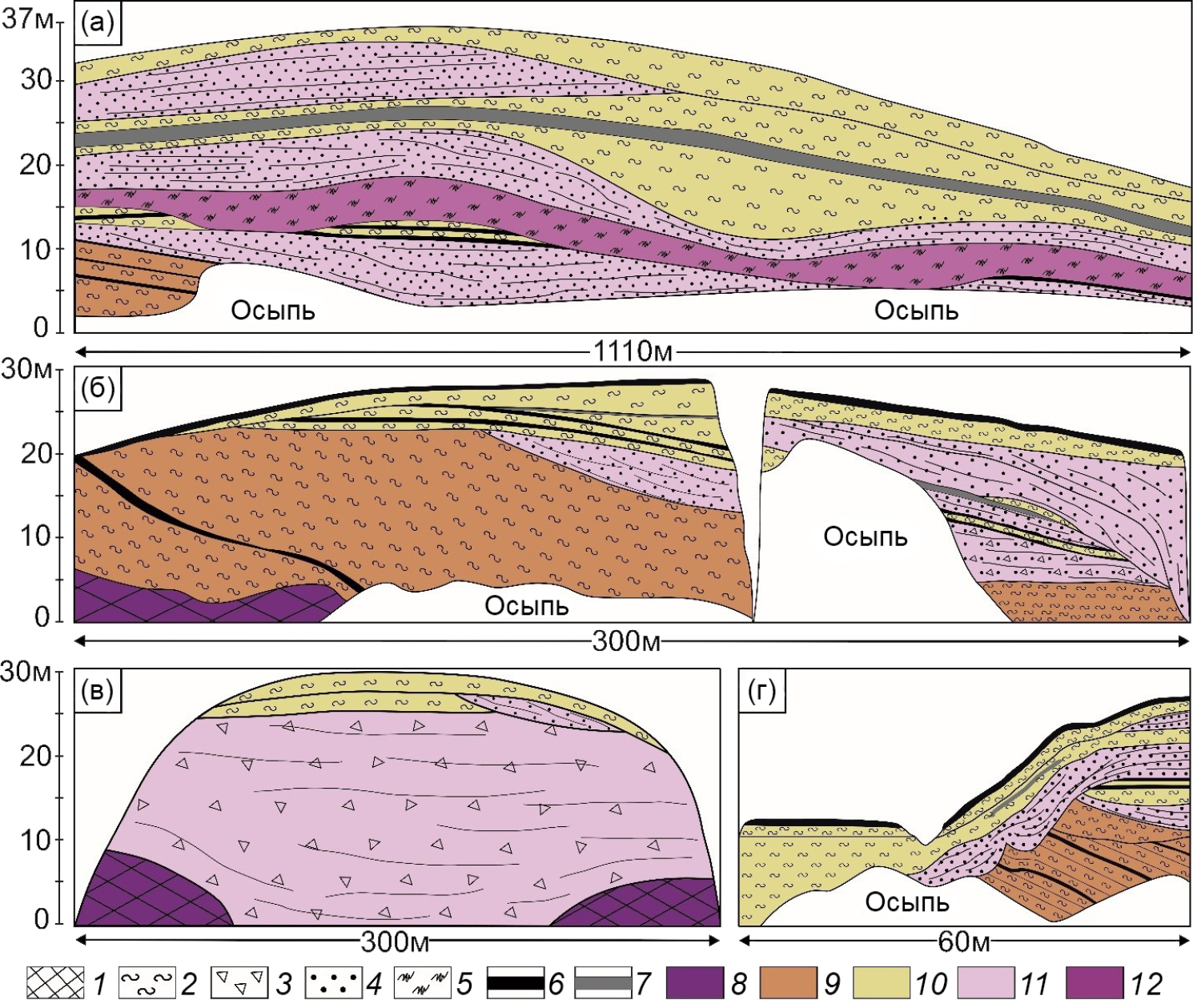 Как правило, флювиальные отложения ложатся на подстилающие отложения с размывом и четко выраженным структурным несогласием, что видно на рис. 4, (а, б, г) по срезанию палеопочв и других геологических границ. Вместе с тем местами в подошве флювиальных отложений отсутствует размыв, и их подошва ложится облекающе на палеопочвы. Кроме того, нередко верхняя часть субаэральных толщ преобразована в миктит с пятнисто-полосчатыми текстурами грязевого жидко-пластичного течения. В таких миктитах присутствуют лито-фациальные разности от отторженцев с диффузионными взаимопроникающими контактами (см. рис. 2, (б)) до перемешанной однородной несортированной смеси (кривая 8 на рис. 3, (в)). Эти неслоистые пески и алевропески включены в состав флювиальных толщ, за исключением средней флювиальной тощи, на нижнем контакте которой в результате интенсивного переотложения достаточно мощной последовательности палеопочв, грязевые миктиты, насыщенные аллохтонным гумусом, приобрели контрастно выраженный серый цвет, что позволило выделить их в отдельное геологическое тело (см. рис. 4, (а)).