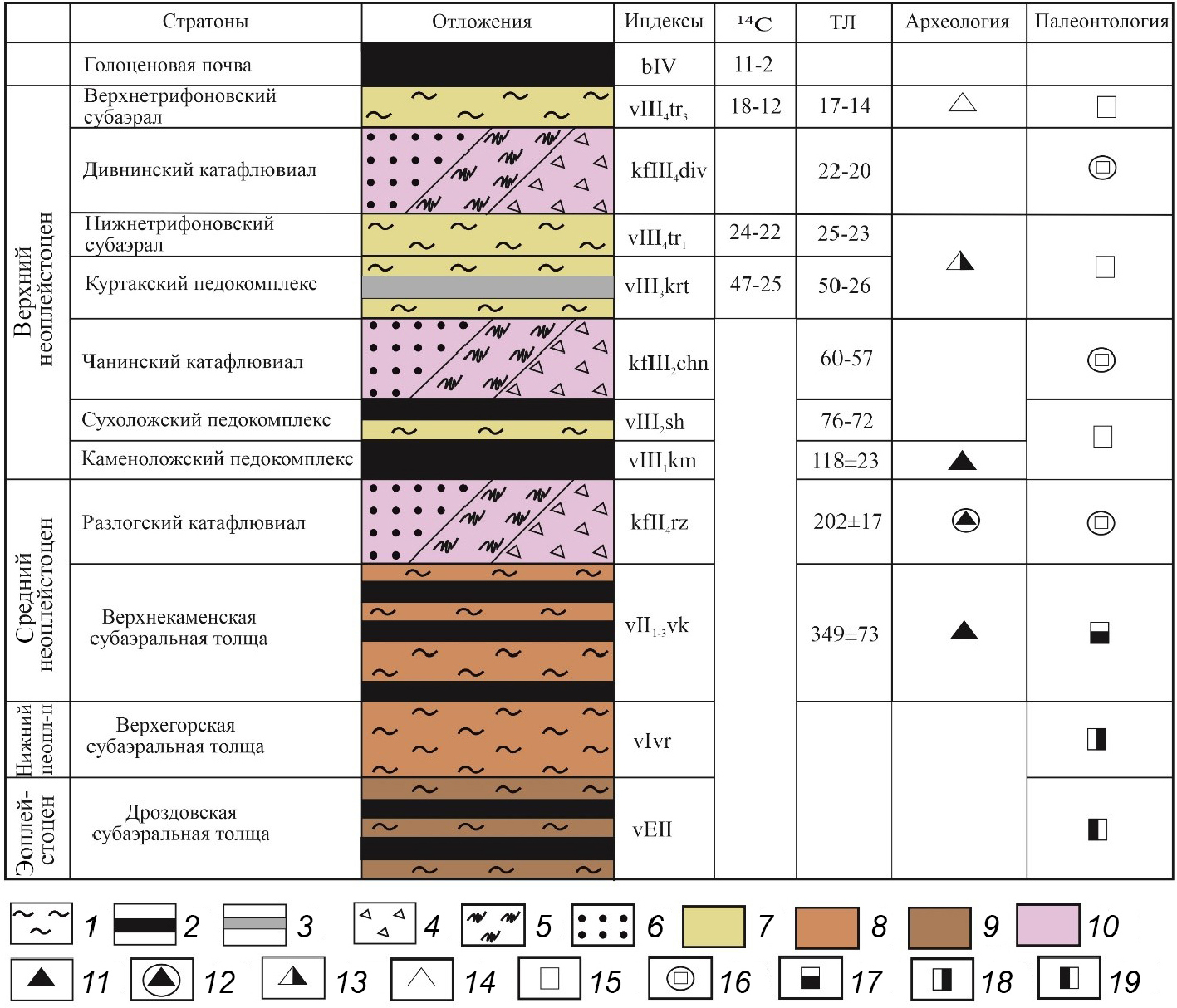1 – субаэральные отложения; 2 – автоморфные палеопочвы; 3 – эфемерные палеопочвы и педолиты; 4 – грубообломочные отложения; 5 – миктиты; 6 – флювиальные отложения; 7 – палевые опесчаненые лёссы; 8 – типичные коричневые лёссы; 9 – эоплейстоценовый субаэральный комплекс; 10 – суперпаводковые (катафлювиальные) отложения; 11 – археологические объекты раннего палеолита; 12 – археологические объекты раннего палеолита сомнительного происхождения; 13 – археологические объекты раннего верхнего палеолита; 14 – археологические объекты позднего верхнего палеолита; 15 – мамонтовый фаунистический комплекс; 16 – переотложенные фаунистические остатки более древние, чем вмещающие отложения; 17 – хазарский фаунистический комплекс; 18 – вяткинский фаунистический комплекс; 19 – раздольинский фаунистический комплекс.