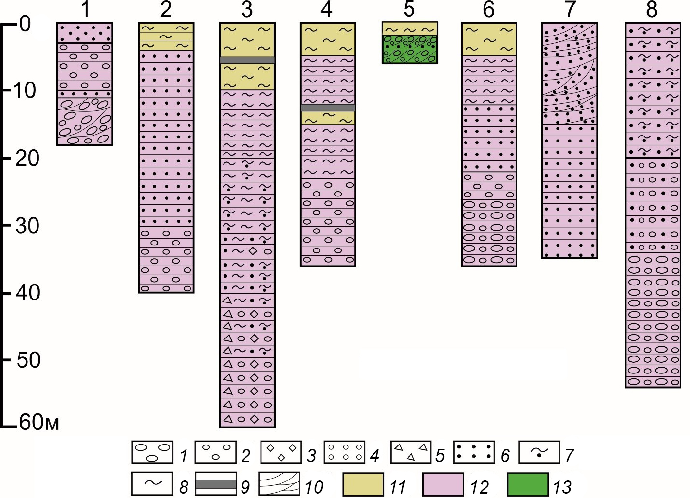 1 – валуны; 2 – гальки; 3 – щебень; 4 – гравий; 5 – дресва; 6 – песок; 7 – алевропесок; 8 – алеврит; 9 – палеопочва; 10 – слоистость; 11 – субаэральные отложения; 12 – суперпаводковые отложения; 13 – аллювий. Номера разрезов расшифрованы в тексте и даны в условных обозначениях к рис. 1.