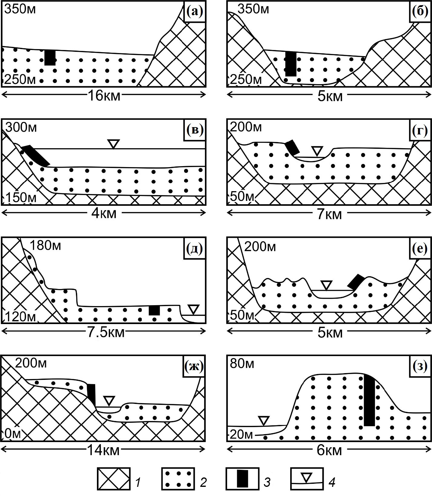 Вышеописанные дресвяно-щебне-галечные отложения, не только залегают на кровле фундамента в виде самостоятельного “базального” слоя, но и нередко в виде прослоев и линз переслаиваются вместе с хорошо промытыми песками, алевропесками, алевритами (рис. 2, (г)), совокупно с ними достигая видимой мощности более 10 м. При изучении Бережековского разреза Куртакского района до заполнения Красноярского водохранилища (Горшков, 1966) на цоколе палеозойских пород были описаны снизу вверх: щебне-галечники, мощностью 5–10 м, которые перекрыты параллельно переслаивающимися песками и алевритами, мощностью до 40 м; при этом в песках и алевритах отмечаются линзы и прослои грубообломочного материала. Отметим, что в первоисточнике (Горшков, 1966) приведен разрез протяженностью 1.1 км вдоль берега Енисея. Фациальная изменчивость на разрезе отсутствует так же, как и геологические тела, которые можно было бы проинтерпретировать как старичные или пойменные фации аллювия.