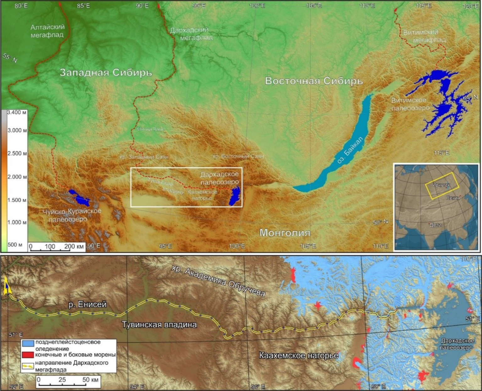 Рис. 1. Местоположение трех крупнейших палеоозер (Чуйско-Курайское, Дархадское, Витимское) и связанных с ними гляциальных суперпаводков Восточной Сибири: Алтайский, Дархадский и Витимский.