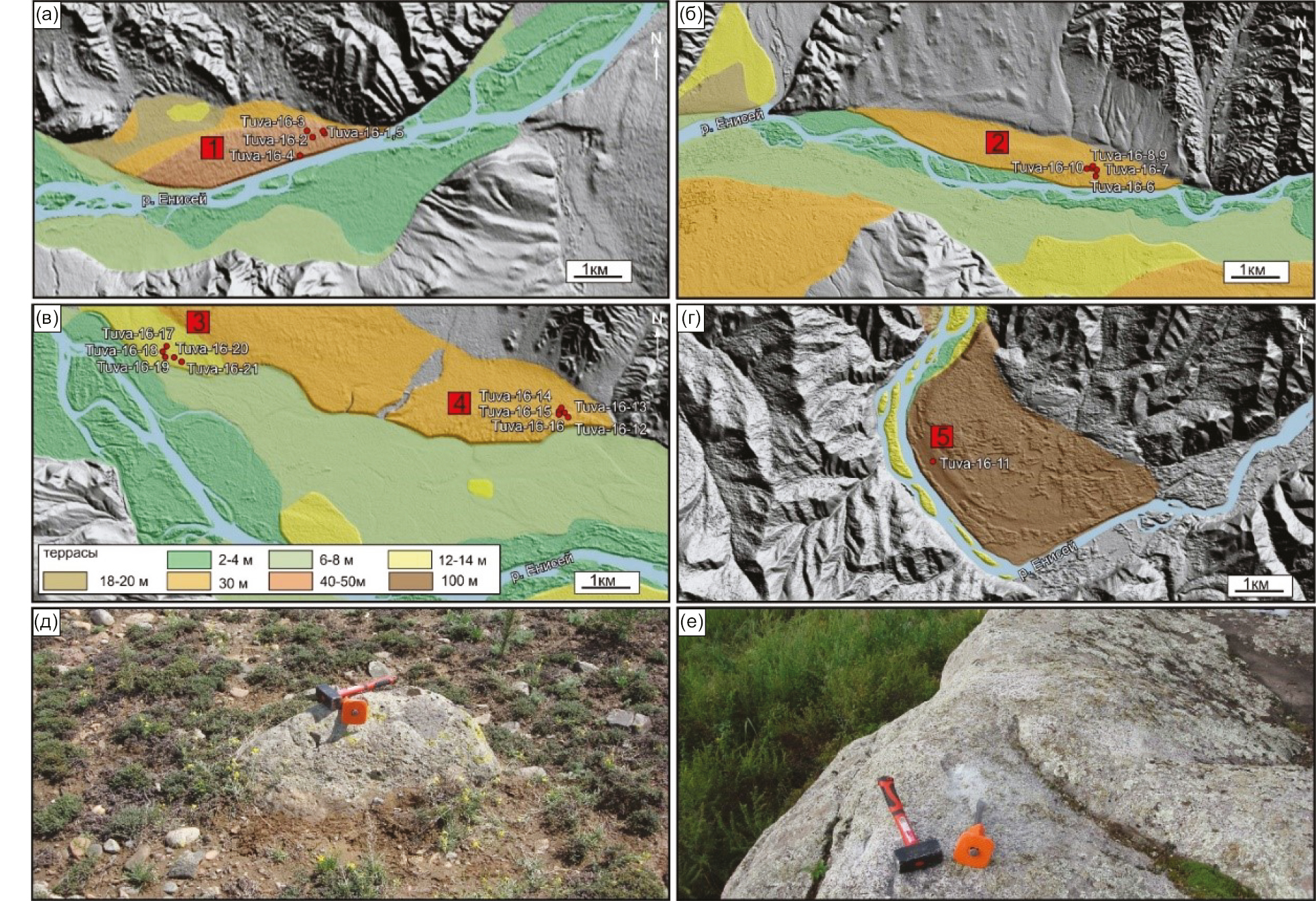 Рис. 3. Уровни террас, гигантской ряби течения и баров. Фон – цифровая модель рельефа TanDEM-X. Красными точками показано местоположение образцов, взятых на космогенное (¹⁰Be) датирование (а, б, в, г). Примеры валунов, с которых отбирались образцы (д, е).