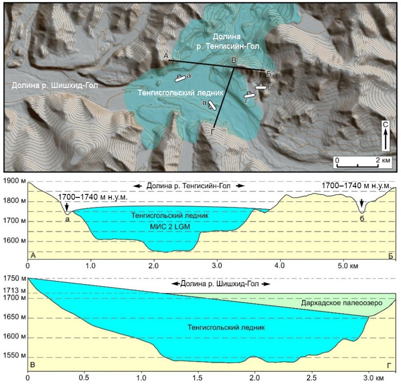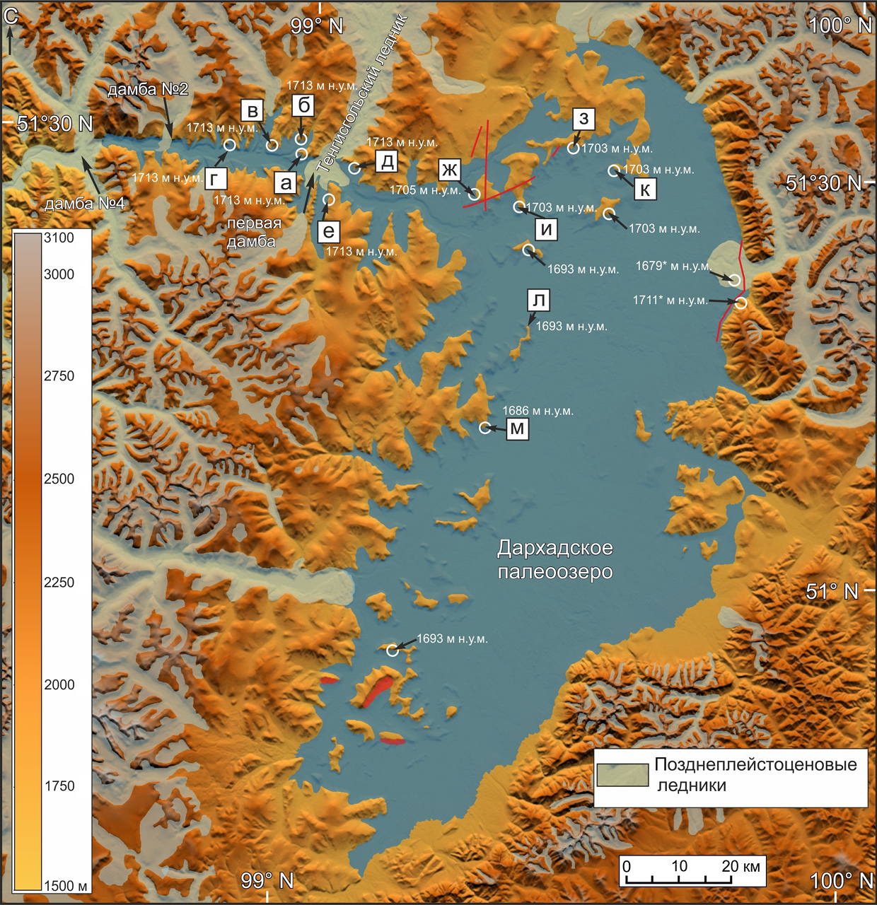 Геолого-геоморфологический анализ, картирование и датирование четвертичных отложений показали, что единственно возможной причиной формирования позднеплейстоценового Дархадского озера могли быть ледники, выходившие из боковых притоков р. Шишхид-Гол (рис. 2) и блокировавшие сток вниз по долине (Гросвальд, Рудой 1996; Krivonogov et al., 2005; Gillespie et al., 2008; Komatsu et al., 2009; Komatsu et al., 2016). С. Кривоногов и др. (Krivonogov et al., 2005) выделил один подпор в районе устья р. Тэнгисйин-Гол. По данным А. Гиллеспи и др. (Gillespie et al., 2008), имелось две ледниковые дамбы в устьях рек Тэнгисйин-Гол и Гадар-Усийн-Гол. Г. Коматсу с соавторами (Komatsu et al., 2009) и Ж. Батбаатар и др. (Batbaatar, Gillespie, 2016a) предположили, что существовало три ледниковые дамбы. Самая нижняя из них располагалась в устье р. Хара-Бярангийн-Гол. Выделяя разное количество ледниковых плотин, исследователи сошлись в едином мнении, что основным подпором являлся ледник, выходивший из долины р. Тэнгисийн-Гол. Остальные ледники, выдвигавшиеся в долину р. Шишхид-Гол ниже устья р. Тэнгисийн-Гол, имели гораздо меньшую абсолютную высоту, и не могли формировать подпор для Дархадского палеоозера (рис. 2) (Гросвальд, Рудой, 1996; Krivonogov et al., 2005; Gillespie et al., 2008; Komatsu et al., 2009; Batbaatar, Gillespie, 2016 a, b; Komatsu et al., 2016).