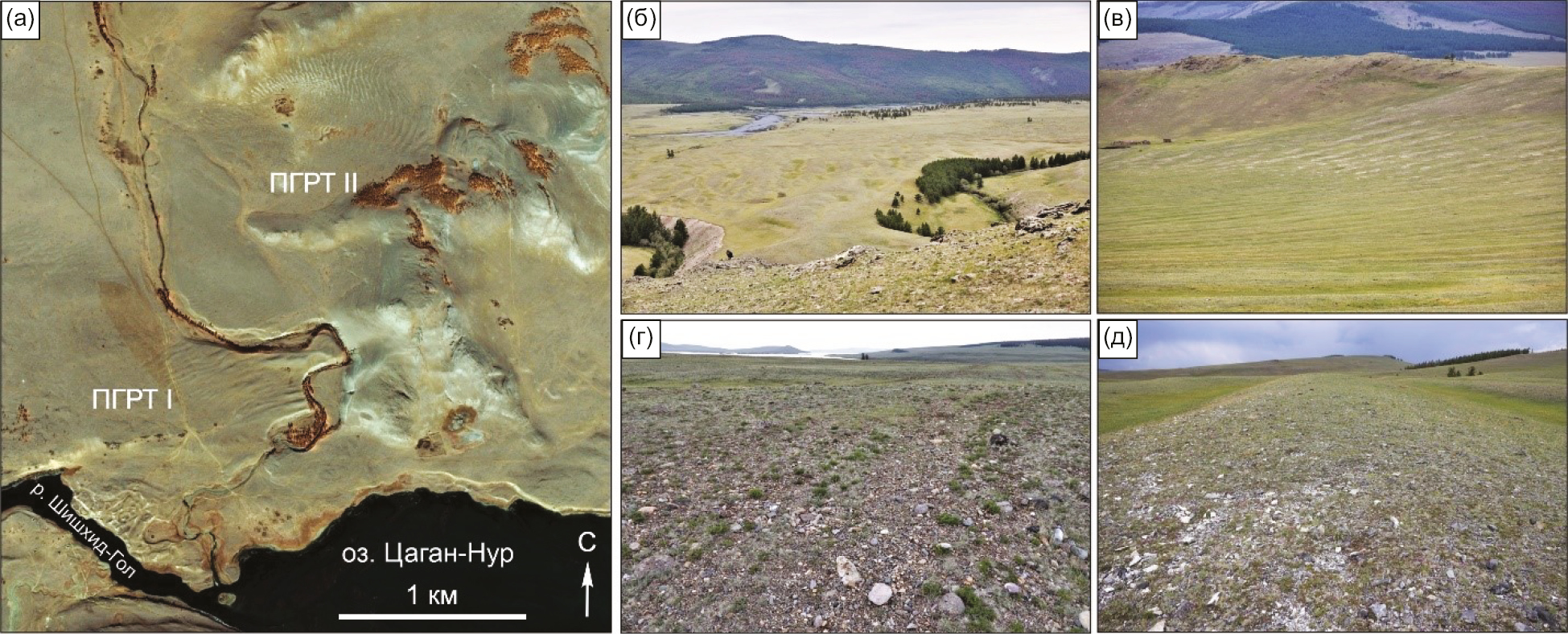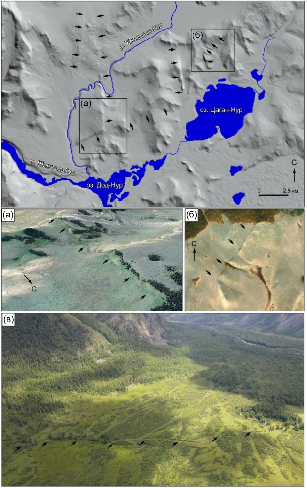 В северной части Дархадской впадины выявлен сбросовый разлом меридионального простирания с амплитудой смещения от 25 м на юге до 60 м на севере. Смещение по разлому привело к частичному опусканию и погребению долины реки Хогоргын-Гол (рис. 7, (а)). Широтный сбросовый разлом с амплитудой смещения около 50 м расположен к северу от озера Доод-Цаган-Нур. Он протягивается от долины р. Хогоргын-Гол, пересекает южную часть меридионального разлома и заканчивается в районе озера Тарган-Нур (рис. 7). Еще один комплекс деформаций расположен к востоку от вышеописанных и представлен уступом северо-восточного простирания на южном склоне небольшого хребта (рис. 7, (б)).