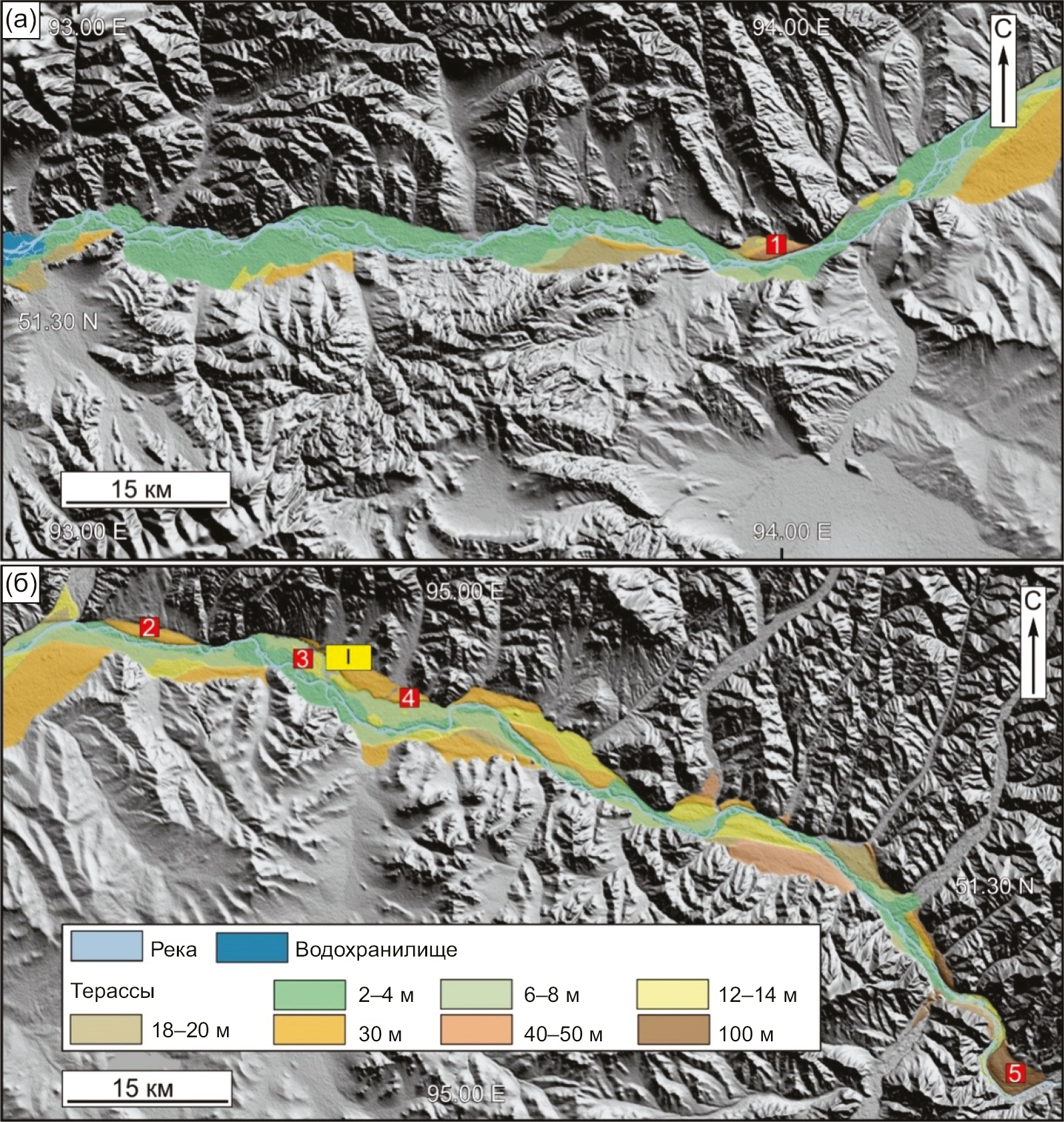 Построение карт и схем происходило следующим образом. Первичный анализ проводился на основе данных SRTM (разрешение 90 м). Далее привлекались данные ALOS (30 м) и данные TanDEM-X (12 м). Для детализации мы использовали космоснимки различного разрешения, которые накладывались на рельеф для получения качественного трехмерного изображения, предоставляющего возможность детального анализа элементов эрозионного и аккумулятивного рельефа. Для исключения форм рельефа, связанных с литологическим фактором (например, линейных уступов на склонах долины) мы использовали геологические карты (Геологическая карта… 1964), привязанные к текущей системе координат. Также геологические карты дали информацию о границах распространения четвертичных отложений, что было важно при интерпретации распространения осадков Дархадского суперпаводка.
