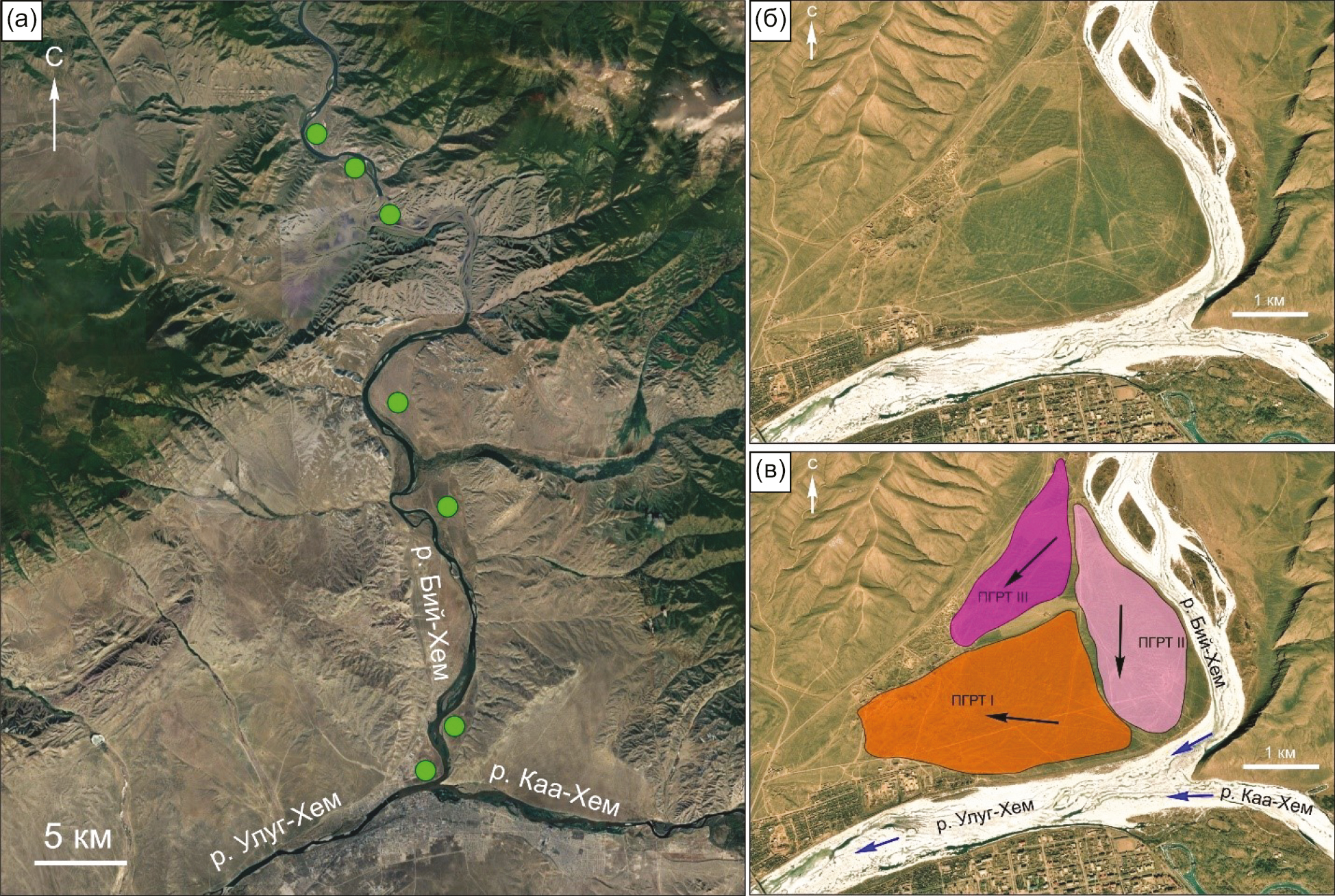 ПГРТ № 1 (51°33.883´N; 93°59.016´E) (рис. 3, (а)) овальной формы расположено на правом берегу р. Улуг-Хем в 30 км ниже по течению от г. Кызыл и составляет 8×2 км. Галечно-валунные отложения залегают на нескольких уровнях сохранившихся террас общей площадью 11.5 км². Максимальная высота над урезом воды составляет 30–40 м, минимальная 14–16 м. Непрерывный переход элементов ГРТ с высокого уровня на более низкий, свидетельствует об одновременном их формировании. Наличие в тыловой части террасы, в области контакта со склоном, значительного понижения и его отсутствие в изголовье дюны, свидетельствует о возможном существовании в прошлом уровня террасы высотой 10–12 м, погребенного в процессе Дархадского суперпаводка. В продольном и поперечном профилях выделяется валообразная структура. На поверхности преобладают валы высотой 1–2 м с увеличением их к центральной части до 6–8 м. На восточной оконечности 35 м террасы с поверхности валунов были взяты 5 образцов (Tuva-16-1,2,3,4,5).