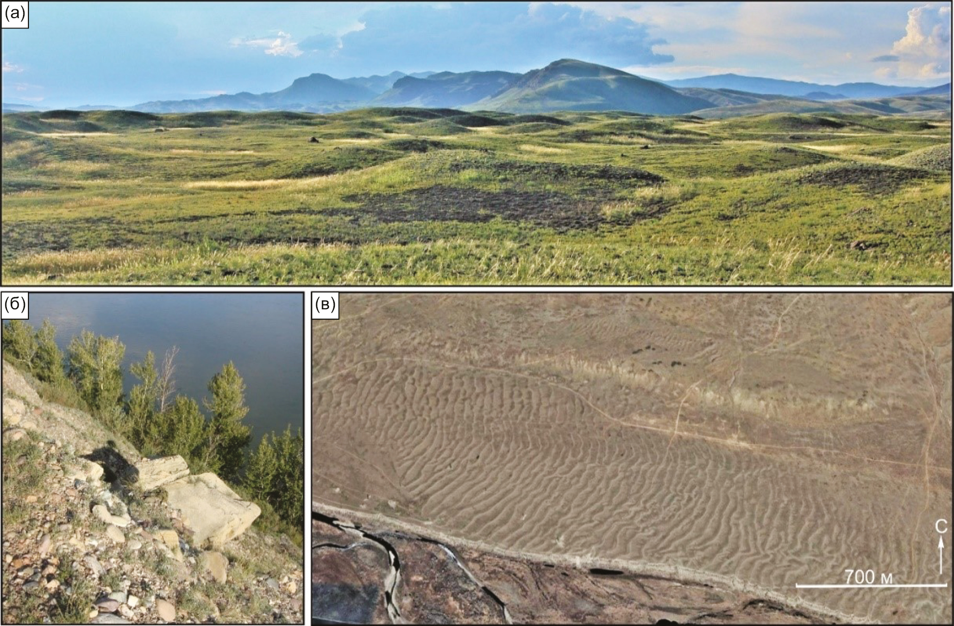 Выявленные сейсмогенные нарушения в восточной части Дархадской впадины (рис. 5, 7, (в)) в районе Джарагольской конечной морены (Сейсмотектоника и сейсмичность… 1993; Arzhannikova et al., 2024) свидетельствуют о продолжающихся активных тектонических движениях в этом районе. Сейсмогенные нарушения с максимальной амплитудой 8 м смещают пролювиальные, колювиальные и ледниковые отложения. Видимая на поверхности протяженность разлома составляет 13 км.