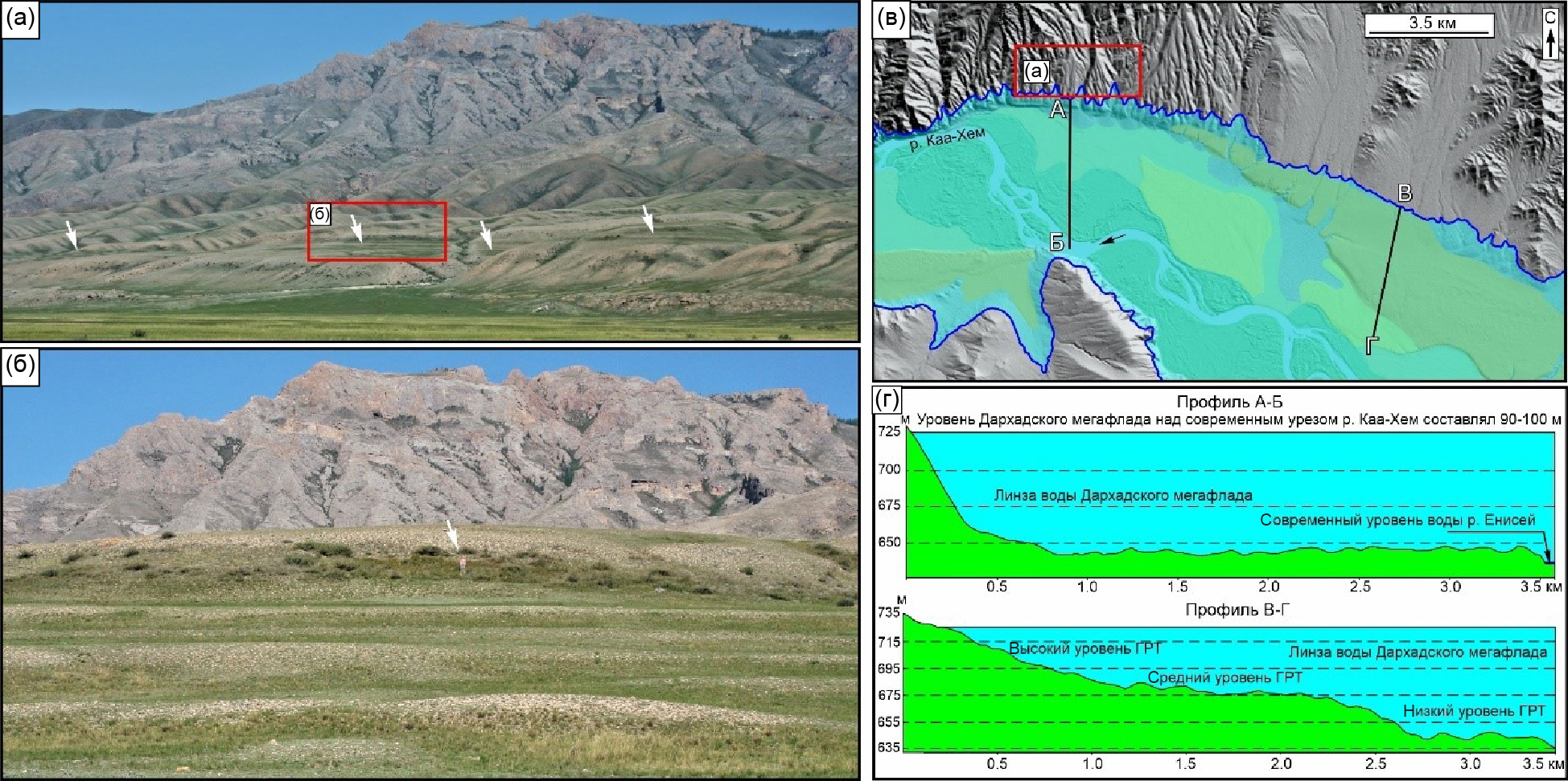 Первым кто предположил, что комплекс аккумулятивно-эрозионных форм в долине р. Енисей (Кызыл-Хем, Каа-Хем и Улуг-Хем) является результатом сброса воды из Дархадского палеоозера, был М.Г. Гросвальд (Взаимодействие… 1987). Сопоставив комплекс данных о существовании палеоозера в Дархадской впадине в ледниковое время, наличии гигантского каньона (кули), выработанного в вулканических лавах в долине р. Каа-Хем, и системы ГРТ, он пришел к выводу об имевшем место в прошлом суперпаводке.