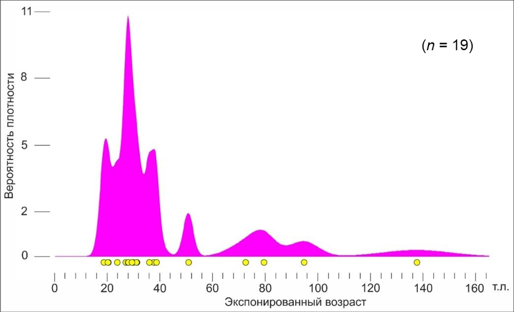 Для определения возраста экспонированных поверхностей валунов, расположенных в пределах ПГРТ, нами использовался метод космогенного датирования по ¹⁰Be (Wagner, 1998; Stone, 2000; Gosse, Phillips, 2001). Датирование проводилось в Европейском центре исследований и преподавания в области геонаук об окружающей среде (CEREGE, CNRS), Франция.